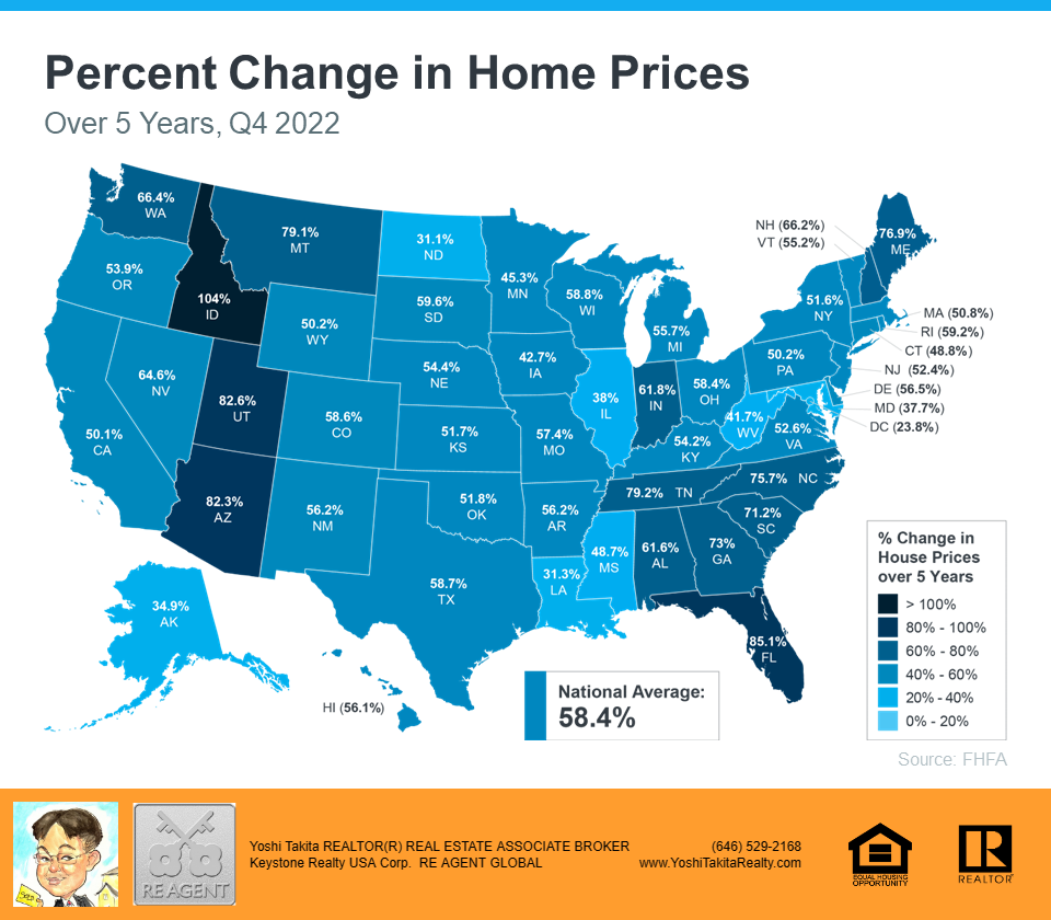 Equity Gains for Today’s Homeowners Equity Gains for Today’s Homeowners | MyKCM Today’s homeowners are sitting on significant equity, even as home price appreciation has eased recently. If you’re a homeowner, your net worth got a boost over the past few years thanks to rising home prices. Here’s what it means for you, even as the market moderates. How Equity Has Grown in Recent Years Because of the imbalance between how many homes were for sale and the number of homebuyers in the market over the past few years, home prices appreciated substantially. And while price appreciation has slowed this year, that doesn’t mean you’ve lost all the equity in your home. In fact, the latest Homeowner Equity Insights report from CoreLogic finds the average homeowner’s equity has grown by $34,300 over the past year alone. And if you’ve been in your home longer than that, chances are you have even more equity than you realize. While that’s the national number, if you want to know what happened in your area, look at the map below from the Federal Housing Finance Agency (FHFA). It shows on average how much home prices have risen over the past five years, which has been a major driver behind equity growth. Why This Is So Important Right Now While equity helps increase your overall net worth, it can also help you achieve other goals, like buying your next home. When you sell your current house, the equity you’ve built up comes back to you in the sale, and it may be just what you need to cover a large portion – if not all – of the down payment on your next home. So, if you’ve been holding off on selling, it may be time to find out how much equity you have and how it can help fuel your next move. Bottom Line Homeownership is a long game, and if you’re planning to make a move, the equity you’ve gained over time can make a big impact. To find out just how much equity you have in your current home and how you can use it to fuel your next purchase, let’s connect.