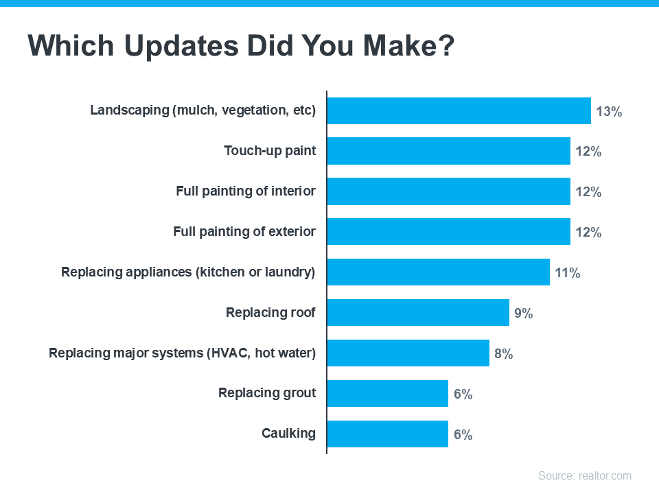 Get Ready: The Best Time To List Your House Is Almost Here If you’re thinking about selling this spring, it’s time to get moving – the best week to list your house is fast approaching. Experts at realtor.com looked at seasonal trends from recent years (excluding 2020 as an uncharacteristic year due to the onset of the pandemic) and determined the ideal week to list a house this year: “Home sellers on the fence waiting for that perfect moment to sell should start preparations, because the best time to list a home in 2023 is approaching quickly. The week of April 16-22 is expected to have the ideal balance of housing market conditions that favor home sellers, more so than any other week in the year.” If you’ve been waiting for the best time to sell, this is your chance. But remember, before you put your house on the market, you’ve got to get it ready. And if you haven’t started that process yet, you’ll need to move quickly. Here’s what you should keep in mind. Work with an Agent To Determine Which Updates To Make Start by prioritizing which updates you’ll make. In February, realtor.com asked more than 1,200 recent or potential home sellers what updates they ended up making to their house before listing it (see graph below): As you can see, the most common answers included landscaping and painting. Work with a trusted real estate agent to determine what projects make the most sense for your goals and local market. If Possible, Plan To Have Your House Staged Once you’ve made any necessary repairs and updates to your house, consider having it staged. According to the National Association of Realtors (NAR), 82% of buyers’ agents said staging a home made it easier for a buyer to visualize the property as a future home. Additionally, almost half of buyers’ agents said home staging had an effect on most buyers’ view of the home in general. Homes that are staged typically sell faster and for a higher price because they help potential buyers more easily picture their new life in the house. Bottom Line Are you ready to sell this spring? Let’s connect to plan your next steps. You can start by making a checklist of what you think your house needs to get ready. Then, we can work together to prioritize your list and move forward together.