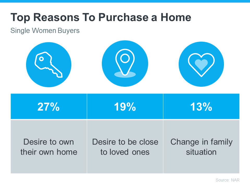 How Homeownership Is Life Changing for Many Women Throughout Women’s History Month, we reflect on the impact women have in our lives, and that includes impact on the housing market. In fact, since at least 1981, single women have bought more homes than single men each year, and they make up 17% of all households. Why Is Homeownership So Important to Women? The rise in women pursuing homeownership hasn’t just made an impact on the housing market. It’s also been an asset for those buyers and their households. That’s because homeownership has many benefits, both financial and personal. On the financial side, housing proves to be the key to building wealth for single women. Ksenia Potapov, Economist at First American, says: “For single women, housing has always made up a large share of total assets. Over the last 30 years, the average single woman’s wealth has increased 88% on an inflation-adjusted basis, from just over $142,000 in 1989 to $267,000 in 2019, and housing has remained the single largest component of their wealth.” The financial security and independence homeownership provides can be life changing, too. And when you factor in the personal motivations behind buying a home, that impact becomes even clearer. A recent report from the National Association of Realtors (NAR) shares the top reasons single women are buying a home right now (see chart below): Bottom Line Homeownership can be life changing no matter who you are. Let’s connect today to talk about your goals in the housing market.
