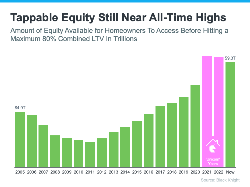 A Drop in Equity Doesn’t Mean Low Equity You may see media coverage talking about a drop in homeowner equity. What’s important to understand is that equity is tied closely to home values. So, when home prices appreciate, you can expect equity to grow. And when home prices decline, equity does too. Here’s how this has played out recently.  Home prices rose rapidly during the ‘unicorn’ years. That gave homeowners a considerable equity boost. But those ‘unicorn’ years couldn’t last forever. The market had to moderate at some point, and that’s what we saw last fall and winter.  As home prices dropped slightly in the back half of 2022, equity was impacted. Based on the most recent report from CoreLogic, there was a 0.7% dip in homeowner equity over the last year. However, the headlines reporting on that change aren’t painting the whole picture. The reality is, while home price depreciation during the second half of last year caused equity to drop, the data shows homeowners still have near record amounts of equity.  The graph below helps illustrate this point by looking at the total amount of tappable equity in this country going all the way back to 2005. Tappable equity is the amount of equity available for homeowners to access before hitting a maximum 80% loan-to-value ratio (LTV). As the data shows, there was a significant equity boost during the ‘unicorn’ years as home prices rapidly appreciated (see the pink in the graph below). But here’s what’s key to realize – even though there’s been a small dip, total homeowner equity is still much higher than it was before the ‘unicorn’ years. And there’s more good news. Recent home price reports show the worst home price declines are behind us, and prices have started to go up again. As Selma Hepp, Chief Economist at CoreLogic, explains: “Home equity trends closely follow home price changes. As a result, while the average amount of equity declined from a year ago, it increased from the fourth quarter of 2022, as monthly home prices growth accelerated in early 2023.”  The last part of that quote is particularly important and is the piece of the puzzle the news is leaving out. To further emphasize the positive turn we’re already seeing, experts say home prices are forecast to appreciate at a more normal rate over the next year. In the same report, Hepp puts it this way: “The average U.S. homeowner now has more than $274,000 in equity – up significantly from $182,000 before the pandemic. Also, while homeowners in some areas of the country who bought a property last spring have no equity as a result of price losses, forecasted home price appreciation over the next year should help many borrowers regain some of that lost equity.” And even though Odeta Kushi, Deputy Chief Economist at First American, references a slightly different number, Kushi further validates the fact that homeowners have a lot of equity right now:  “Homeowners today have an average of $302,000 in equity in their homes.” That means if you’ve owned your home for a few years, you likely still have way more equity than you did before the ‘unicorn’ years. And if you’ve owned your home for a year or less, the forecast for more typical price appreciation over the next year should mean your equity is already on the way back up. Bottom Line Context is everything when looking at headlines. While homeowner equity dropped some from last year, it’s still near all-time highs. Let’s connect so you can get the answers you deserve from an expert who’s here to help as you plan your move this year.