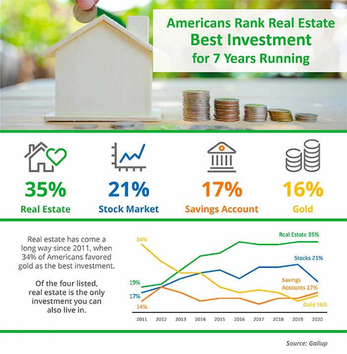 Some Highlights Real estate has outranked stocks, savings accounts, and gold as the best long-term investment among Americans for the past 7 years. The belief in the stability of housing as a long-term investment remains strong, despite the many challenges our economy faces today.