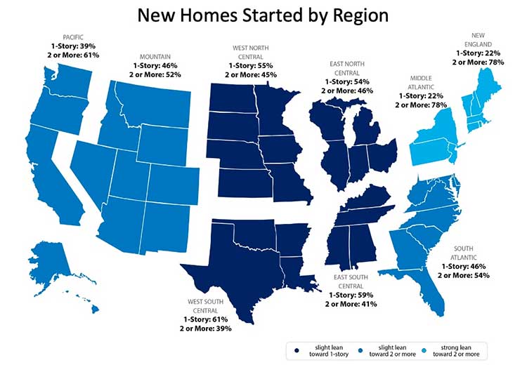 Here’s a map showing the breakdown of newly constructed homes being built by region, and the percentage of 1-story and 2-story homes in that mix: