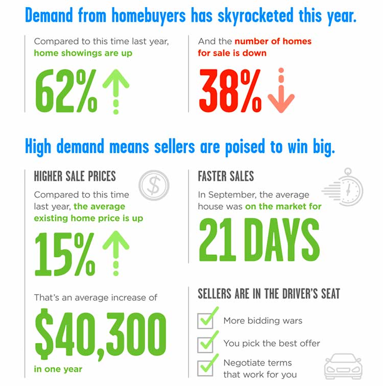 Demand from homebuyers has skyrocketed this year, which means today’s sellers are poised to win big. This ideal moment in time to sell your house won’t last forever, though.