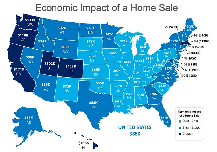 These factors are driving a positive impact on the economy as a whole. According to the National Association of Realtors (NAR), the real estate industry provided $3.7 billion dollars of economic impact to the country last year. To break it down, in 2019, the average newly constructed home contributed just over $88,000 per build to local economies. Across the country, real estate clearly makes a significant impact (See map below):