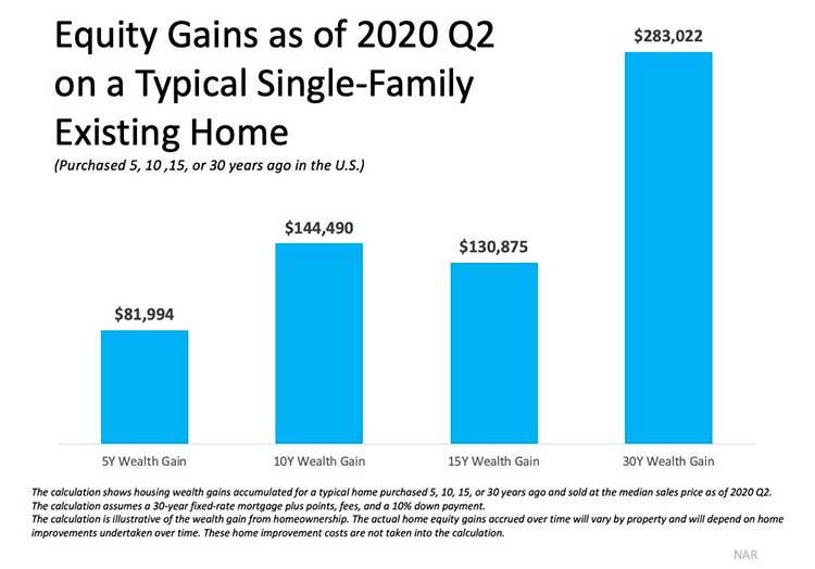 As home values increase and you make payments toward your home loan, you’ll gain wealth through equity. The same article from NAR also addresses how wealth gains tend to play out over time: