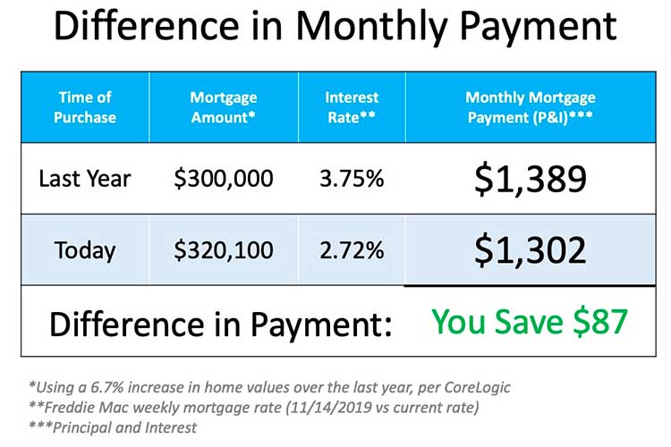 Compared to this time last year, you’ll actually save $87 dollars a month by purchasing that home today, which equates to over one thousand dollars a year.