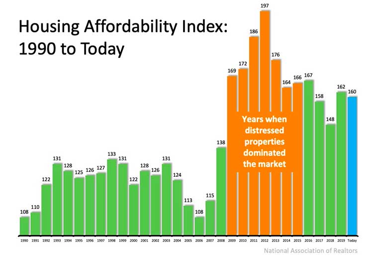 So, the higher the index, the more affordable it is to purchase a home. Here’s a graph of the index going back to 1990: