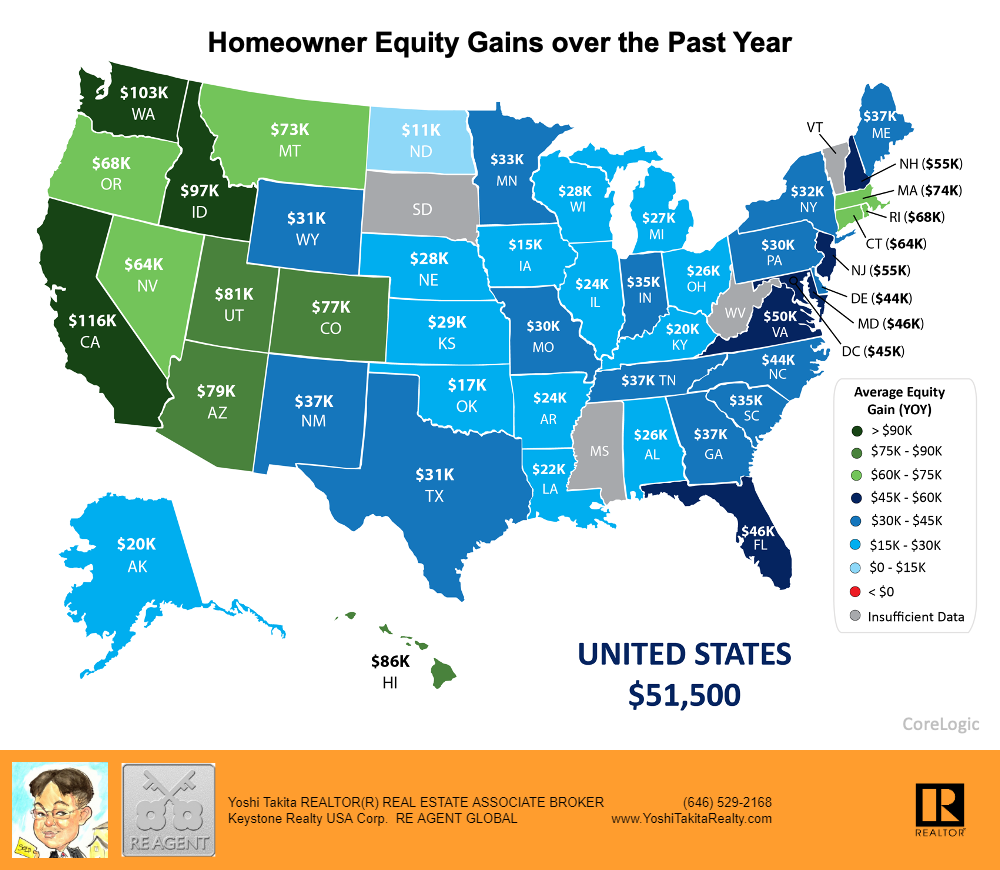 As Home Equity Rises, So Does Your Wealth As Home Equity Rises, So Does Your Wealth | MyKCM Homeownership is still a crucial part of the American dream. For those people who own a home (and those looking to buy one), it’s clear that being a homeowner has considerable benefits both emotionally and financially. In addition to long-term stability, buying a home is one of the best ways to increase your net worth. This boost to your wealth comes in the form of equity. Equity is the difference between what you owe on the home and its market value based on factors like price appreciation. The best thing about equity is that it often grows without you even realizing it, especially in a sellers’ market like we’re in now. In today’s real estate market, the combination of low housing supply and high buyer demand is driving home values up. This is giving homeowners a significant equity boost. According to the latest data from CoreLogic, the amount of equity homeowners have has continued to grow as home values appreciate. Here are some key takeaways from the Homeowner Equity Insights Report: The average homeowner gained $51,500 in equity over the past year There was a 29.3% increase in national homeowner equity year over year To give you an idea of what that looks like in your area, the map below shows the average equity gains by state.As Home Equity Rises, So Does Your Wealth | MyKCM What does all of that mean for you? If you’re already a homeowner, you likely have more equity in your house than you realize. The numbers in the map above reflect year-over-year growth. If you’ve been in your home for longer than a year, you’ll likely have even more equity than that. That equity can take you places. You can use the equity you’ve gained to fuel your next move, achieve other life goals, and more. On the other hand, if you haven’t purchased a home yet, understanding equity can help you realize why homeownership is a worthwhile goal. Homeowners across the nation gained an average of over $50,000 in equity this year. Don’t miss out on this chance to grow your net worth. Bottom Line If you want to learn more, let's connect. A trusted advisor can help you understand where home prices are today, how they contribute to a homeowner’s net worth, and the impact equity can have when you own a home.