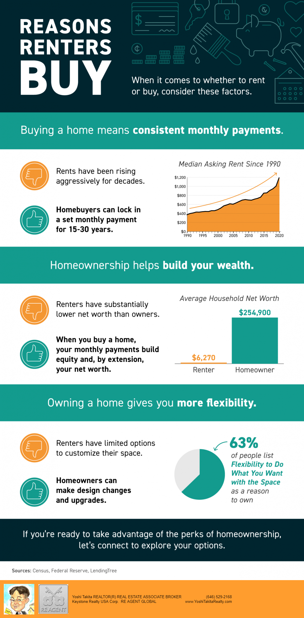 Reasons Renters Buy [INFOGRAPHIC] Reasons Renters Buy [INFOGRAPHIC] | MyKCM Some Highlights When deciding whether you should rent or buy, make sure you’re considering these factors. Buying a home means consistent monthly payments. Homeownership also helps to build your wealth. And owning a home gives you greater flexibility than renting. If you’re ready to take advantage of the perks of homeownership, let’s connect to explore your options.