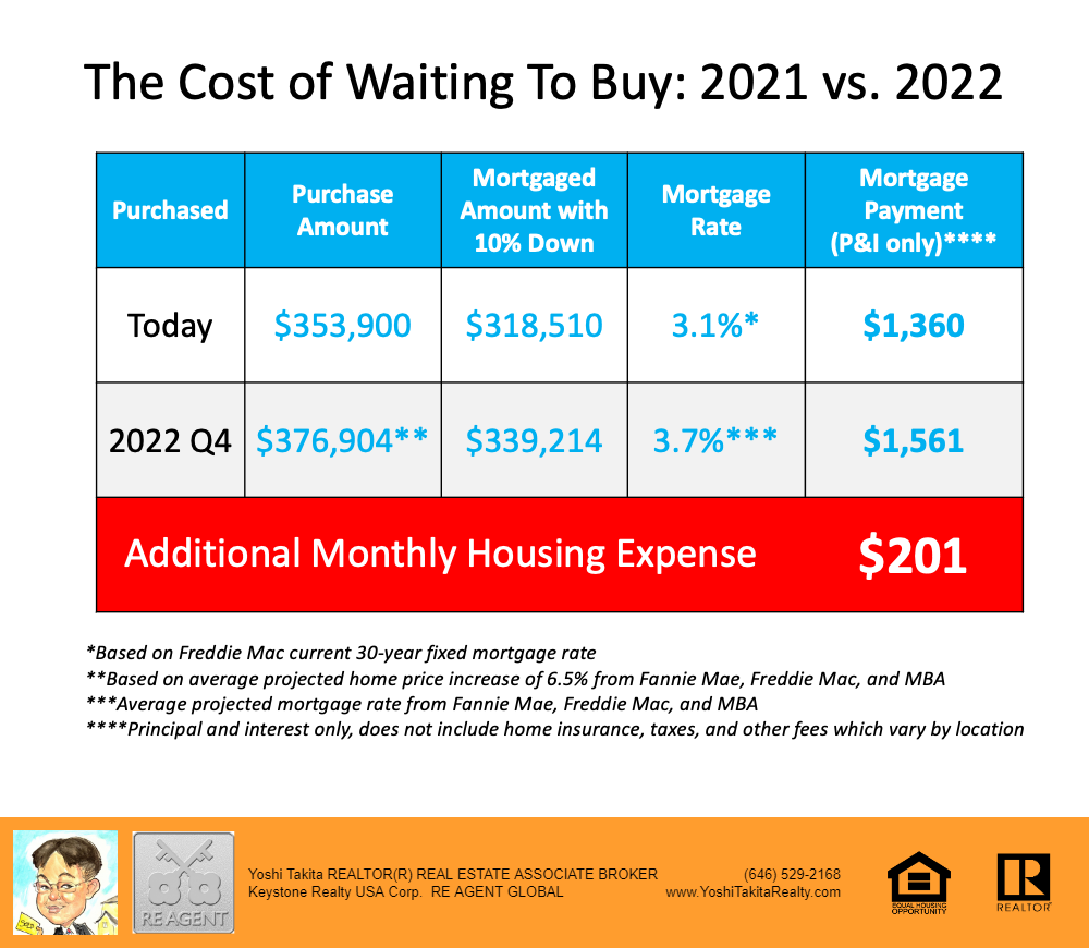 Two Reasons Why Waiting To Buy a Home Will Cost You Two Reasons Why Waiting To Buy a Home Will Cost You | MyKCM If you’re a homeowner who’s decided your current house no longer fits your needs, or a renter with a strong desire to become a homeowner, you may be hoping that waiting until next year could mean better market conditions to purchase a home. To determine whether you should buy now or wait another year, you can ask yourself two simple questions: Where will home prices be a year from now? Where will mortgage rates be a year from now? Let’s shed some light on the answers to both of these questions. Where Will Home Prices Be a Year from Now? Three major housing industry entities are projecting ongoing home price appreciation in 2022. Here are their forecasts: Fannie Mae: 7.4% Freddie Mac: 7% Mortgage Bankers Association: 5.1% According to the National Association of Realtors (NAR), the median price of a home today is $353,900. Using an average of the three price projections above (6.5%), a home that sold for $353,900 today would be valued at $376,904 at the end of next year. As a prospective buyer, you would therefore pay an additional $23,004 by waiting. Where Will Mortgage Rates Be a Year from Now? Today, Freddie Mac announced their 30-year fixed mortgage rate was at 3.1%. However, most experts believe mortgage rates will rise as the economy recovers. Here are the forecasts for the fourth quarter of 2022 by the three major entities mentioned above: Fannie Mae: 3.4% Freddie Mac: 3.7% Mortgage Bankers Association: 4% That averages out to 3.7% if you include all three forecasts. Any increase in mortgage rates will increase your costs. What Does It Mean for You if Home Values and Mortgage Rates Increase? If both variables increase, you’ll pay a lot more in mortgage payments each month. Let’s assume you purchase a $353,900 home today with a 30-year fixed-rate loan at 3.1% (the current rate from Freddie Mac) after making a 10% down payment. According to mortgagecalculator.net, your monthly mortgage payment would be approximately $1,360 (this does not include insurance, taxes, and other fees because those vary by location). That same home one year from now could cost $376,904, and the mortgage rate could be 3.7% (based on the industry forecasts mentioned above). Your monthly mortgage payment after putting down 10%, would be approximately $1,561.Two Reasons Why Waiting To Buy a Home Will Cost You | MyKCMThe difference in your monthly mortgage payment would be $201. That’s $2,412 more per year and $72,360 over the life of the loan. Add to that the approximately $23,004 a house with a similar value would build in home equity this year due to home price appreciation, and the total net worth increase you could gain by buying this year is over $95,364 (the $72,360 mortgage savings plus the $23,004 potential gain in equity if you buy now). Bottom Line When asking if you should buy a home, you may think of the non-financial benefits of homeownership. When asking when to buy, the financial benefits make it clear that doing so now is much more advantageous than waiting until next year.