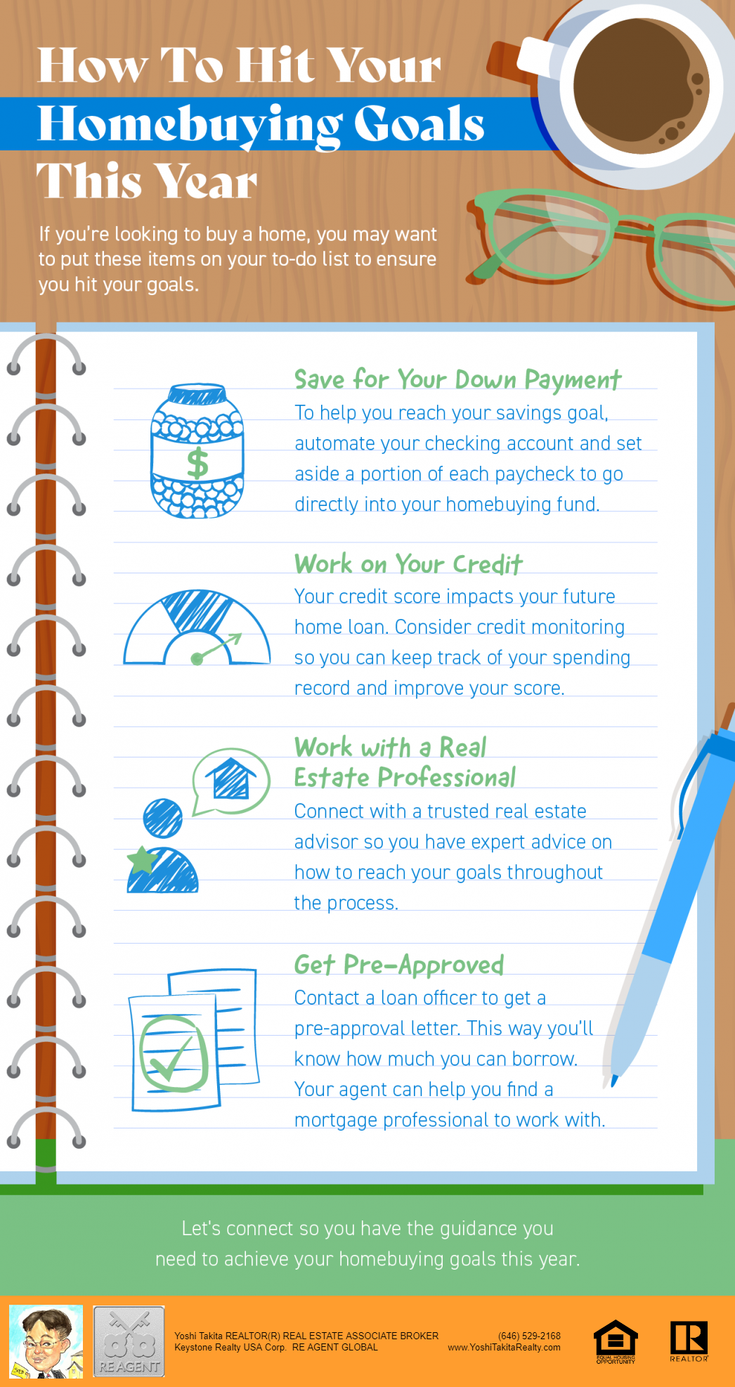 How To Hit Your Homebuying Goals This Year [INFOGRAPHIC] How To Hit Your Homebuying Goals This Year [INFOGRAPHIC] | MyKCM Some Highlights If you’re looking to buy a home, you may want to put these items on your to-do list to ensure you hit your goals. It’s important to start working on your credit and saving for a down payment early. When you’re ready to begin your search, work with a real estate professional and get pre-approved so you know how much you can borrow. Connect with a real estate advisor so you have the guidance you need to achieve your homebuying goals this year.