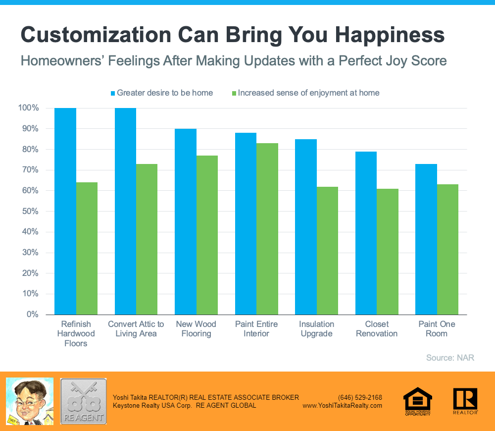 How Homeownership Can Bring You Joy How Homeownership Can Bring You Joy | MyKCM If you're trying to decide whether to rent or buy a home, you're probably weighing a few different factors. The financial benefits of homeownership might be one of the reasons you want to make a purchase if you’re a renter, but the decision can also be motivated by having a place that’s uniquely your own. If you want to express yourself by upgrading and customizing your living space but are feeling held back by your rental agreement, it might be time to consider the perks of owning your home. A Little Change Can Bring Lots of Joy There’s a significant level of pride that comes from owning a home. That’s because it’s a space that truly belongs to you. A recent report from the National Association of Realtors (NAR) shows making updates or remodeling your home can help you feel more at ease and comfortable in your living space. NAR measures this with a Joy Score that indicates how much happiness specific home upgrades bring. According to NAR: “There were numerous interior projects that received a perfect Joy Score of 10: paint entire interior of home, paint one room of home, add a new home office, hardwood flooring refinish, new wood flooring, closet renovation, insulation upgrade, and attic conversion to living area.” The report also breaks down just how much each of these projects can enhance your emotional attachment to your home, even leading you to want to spend even more time in the space (see graph below): How Homeownership Can Bring You Joy | MyKCM And while many of the items NAR highlights are larger tasks, some, like painting rooms, are much smaller. Even those quicker projects can still bring you a greater sense of joy and accomplishment. Not to mention when you make upgrades in your home, you could be increasing its value which also gives your net worth a boost if you invest your time and effort wisely. You’re Free To Update Your Home to Your Heart’s Content These types of updates can result in additional happiness when you complete them, but there’s another reason you can feel good as a homeowner. In most situations, you’re free to renovate or update the interior of your home without needing additional permission. But as Business Insider points out, renters may not have the same freedom: “Your landlord won't always approve changes when you rent. But you have the power to update the home when you're the owner. (Just make sure any big changes are approved by your homeowner's association, if necessary.)” If you do make changes as a renter, there’s a good chance you’ll need to revert them back at the end of your lease based on your rental agreement. That can add additional costs when you move out. That’s one major benefit of owning your own home. Unless there are specific homeowner’s association requirements, you typically won’t have to worry about the changes you can and can’t make. Bottom Line Deciding whether to rent or buy is a personal decision. The financial benefits are critical, but don’t overlook the emotional impact homeownership can have. Let’s connect to discuss all the benefits you can enjoy when you purchase your own home.