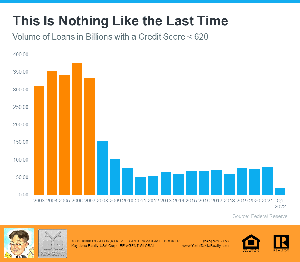 Why Home Loans Today Aren’t What They Were in the Past Why Home Loans Today Aren’t What They Were in the Past | MyKCM In today’s housing market, many are beginning to wonder if we’re returning to the riskier lending habits and borrowing options that led to the housing crash 15 years ago. Let’s ease those concerns. Several times a year, the Mortgage Bankers Association (MBA) releases an index titled the Mortgage Credit Availability Index (MCAI). According to their website: “The MCAI provides the only standardized quantitative index that is solely focused on mortgage credit. The MCAI is . . . a summary measure which indicates the availability of mortgage credit at a point in time.” Basically, the index determines how easy it is to get a mortgage. The higher the index, the more available mortgage credit becomes. Here’s a graph of the MCAI dating back to 2004, when the data first became available: Why Home Loans Today Aren’t What They Were in the Past | MyKCMAs the graph shows, the index stood at about 400 in 2004. Mortgage credit became more available as the housing market heated up, and then the index passed 850 in 2006. When the real estate market crashed, so did the MCAI as mortgage money became almost impossible to secure. Thankfully, lending standards have eased somewhat since then, but the index is still low. In April, the index was at 121, which is about one-seventh of what it was in 2006. Why Did the Index Get out of Control During the Housing Bubble? The main reason was the availability of loans with extremely weak lending standards. To keep up with demand in 2006, many mortgage lenders offered loans that put little emphasis on the eligibility of the borrower. Lenders were approving loans without always going through a verification process to confirm if the borrower would likely be able to repay the loan. An example of the relaxed lending standards leading up to the housing crash is the FICO® credit score associated with a loan. What’s a FICO® score? The website myFICO explains: “A credit score tells lenders about your creditworthiness (how likely you are to pay back a loan based on your credit history). It is calculated using the information in your credit reports. FICO® Scores are the standard for credit scores—used by 90% of top lenders.” During the housing boom, many mortgages were written for borrowers with a FICO score under 620. While there are still some loan programs that allow for a 620 score, today’s lending standards are much tighter. Lending institutions overall are much more attentive about measuring risk when approving loans. According to the latest Household Debt and Credit Report from the New York Federal Reserve, the median credit score on all mortgage loans originated in the first quarter of 2022 was 776. The graph below shows the billions of dollars in mortgage money given annually to borrowers with a credit score under 620. Why Home Loans Today Aren’t What They Were in the Past | MyKCMIn 2006, buyers with a score under 620 received $376 billion dollars in loans. In 2021, that number was only $80 billion, and it’s only $20 billion in the first quarter of 2022. Bottom Line In 2006, lending standards were much more relaxed with little evaluation done to measure a borrower’s potential to repay their loan. Today, standards are tighter, and the risk is reduced for both lenders and borrowers. These are two very different housing markets, and today is nothing like the last time.