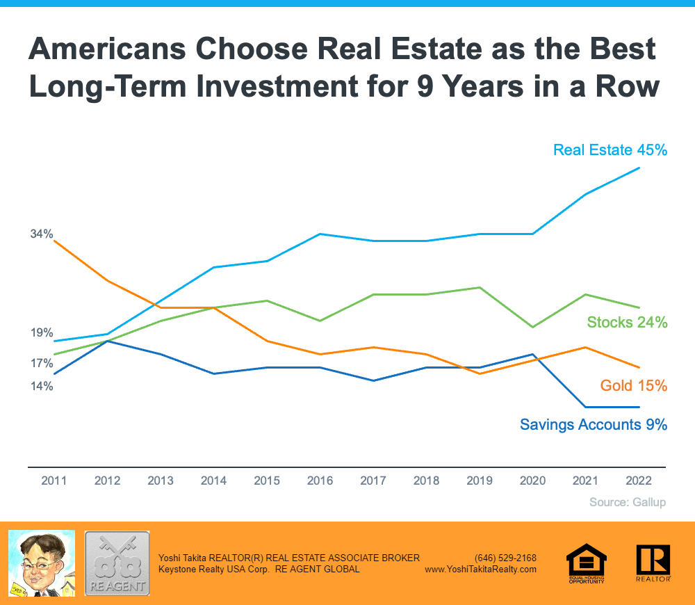 More Americans Choose Real Estate as the Best Investment Than Ever Before More Americans Choose Real Estate as the Best Investment Than Ever Before | MyKCM Americans’ opinion on the value of real estate as an investment is climbing. That’s according to an annual survey from Gallup. Not only is real estate viewed as the best investment for the ninth year in a row, but more Americans selected it than ever before. The graph below shows the results of the survey since Gallup began asking the question in 2011. As the trend lines indicate, real estate has been gaining ground as the clear favorite for almost a decade now: More Americans Choose Real Estate as the Best Investment Than Ever Before | MyKCM If you’re thinking about purchasing a home, let this poll reassure you. Even when inflation is high like today, Americans recognize owning a home is a powerful financial decision. How an Investment in Real Estate Can Benefit You During High Inflation Because inflation reached its highest level in 40 years recently, it’s more important than ever to understand the financial benefits of homeownership. Rising inflation means prices are increasing across the board, and that includes goods, services, housing costs, and more. When you purchase your home, you lock in your monthly housing payments, effectively shielding yourself from increases on one of your biggest budgetary items each month. If you’re a renter, you don’t have that same benefit, and you aren’t protected from these increases, especially as rents rise. As Danielle Hale, Chief Economist at realtor.com, notes: “Rising rents, which continue to climb at double-digit pace . . . and the prospect of locking in a monthly housing cost in a market with widespread inflation are motivating today’s first-time homebuyers.” When Inflation Has Risen in the Past, Home Prices Have Too Your house is also an asset that typically increases in value over time, even during inflation. That‘s because as prices rise, the value of your home does too. Mark Cussen, Financial Writer for Investopedia, puts it like this: “There are many advantages to investing in real estate. . . . It often acts as a good inflation hedge since there will always be a demand for homes, regardless of the economic climate, and because as inflation rises, so do property values. . . .” And since rising home values help increase your equity, and by extension your net worth, homeownership is historically a good hedge against inflation. Bottom Line Buying a home is a powerful decision. It’s no wonder why so many people view it as the best long-term investment, even when inflation is high. When you buy, you help shield yourself from increases in your housing costs and you own an asset that typically gains value with time. If you want to better understand how buying a home could be a great investment for you, let’s connect today.