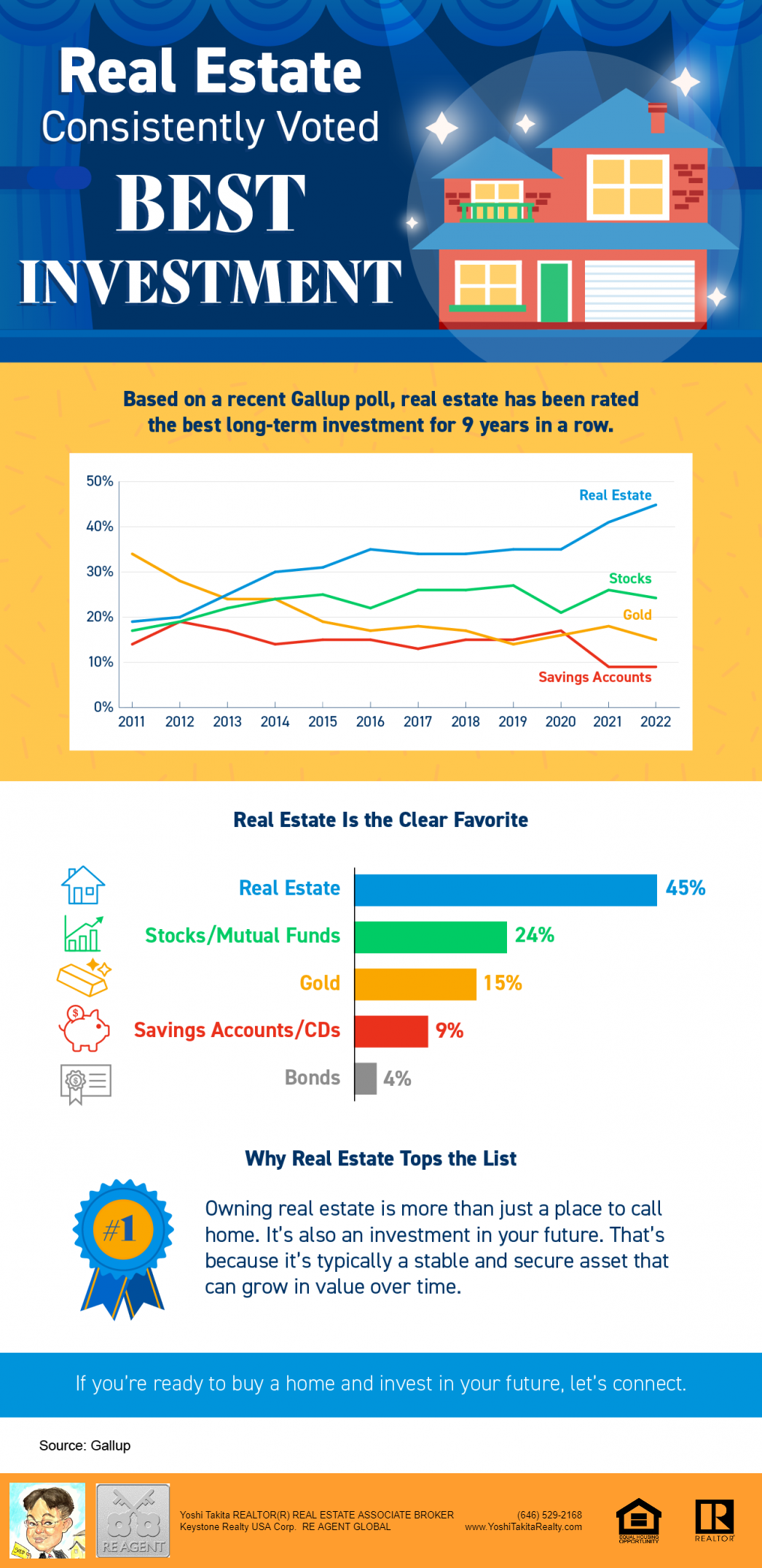 Real Estate Consistently Voted Best Investment [INFOGRAPHIC] Real Estate Consistently Voted Best Investment [INFOGRAPHIC] | MyKCM Some Highlights Based on a recent Gallup poll, real estate has been rated the best long-term investment for nine years in a row. Owning real estate is more than just a place to call home. It’s also an investment in your future. That’s because it’s typically a stable and secure asset that can grow in value over time. If you’re ready to buy a home and invest in your future, let’s connect.