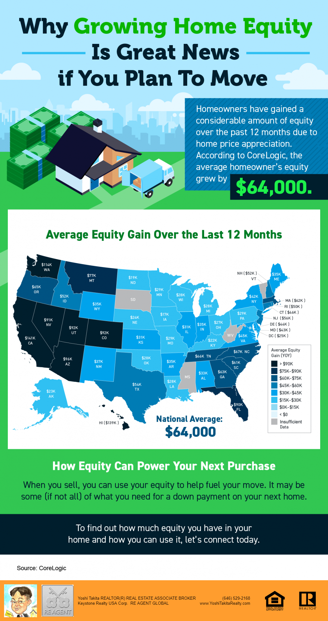 Why Growing Home Equity Is Great News if You Plan To Move [INFOGRAPHIC] Why Growing Home Equity Is Great News if You Plan To Move [INFOGRAPHIC] | MyKCM Some Highlights According to the latest data from CoreLogic, the average homeowner gained $64,000 in home equity over the past 12 months. That much equity can be a game-changer when you move. When you sell, it could be some (if not all) of what you need for a down payment on your next home. To find out how much equity you have in your home and how you can use it, let’s connect today.