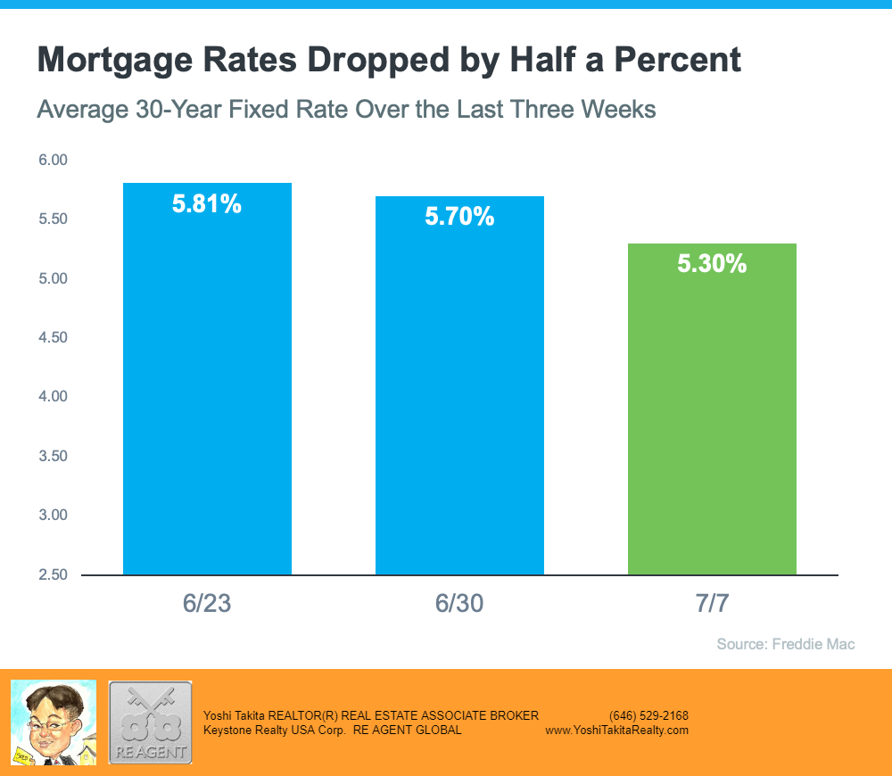 The Drop in Mortgage Rates Brings Good News for Homebuyers The Drop in Mortgage Rates Brings Good News for Homebuyers | MyKCM Over the past few weeks, the average 30-year fixed mortgage rate from Freddie Mac fell by half a percent. The drop happened over concerns about a potential recession. And since mortgage rates have risen dramatically this year, homebuyers across the country should see this decline as welcome news. Freddie Mac reports that the average 30-year rate was down to 5.30% from 5.81% two weeks prior (see graph below): The Drop in Mortgage Rates Brings Good News for Homebuyers | MyKCM But why is this recent dip such good news for homebuyers? As Nadia Evangelou, Senior Economist and Director of Forecasting at the National Association of Realtors (NAR), explains: “According to Freddie Mac, the 30-year fixed mortgage rate dropped sharply by 40 basis points to 5.3 percent. . . . As a result, home buying is about 5 percent more affordable than a week ago. This translates to about $100 less every month on a mortgage payment.” That’s because when rates go up (as they have for the majority of this year), they impact how much you’ll pay in your monthly mortgage payment, which directly affects how much you can comfortably afford. The inverse is also true. A decrease in mortgage rates means an increase in your purchasing power. The chart below shows how a half-point, or even a quarter-point, change in mortgage rates can impact your monthly payment: The Drop in Mortgage Rates Brings Good News for Homebuyers | MyKCM Bottom Line If your home doesn’t meet your needs, this may be the opportunity you’ve been waiting for. Let’s connect to see how you can benefit from the current drop in mortgage rates.