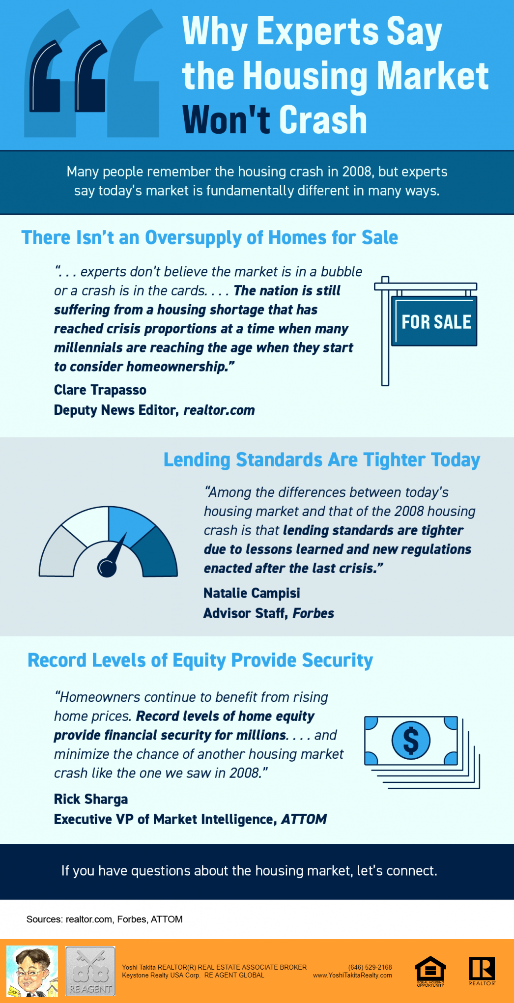Why Experts Say the Housing Market Won’t Crash [INFOGRAPHIC] Why Experts Say the Housing Market Won’t Crash [INFOGRAPHIC] | MyKCM Some Highlights Many people remember the housing crash in 2008, but experts say today’s market is fundamentally different in many ways. First, there isn’t an oversupply of homes for sale today. Plus, lending standards are much tighter, and homeowners have record levels of equity. That means signs say there won’t be a wave of foreclosures like the last time. If you have questions about the housing market, let’s connect.