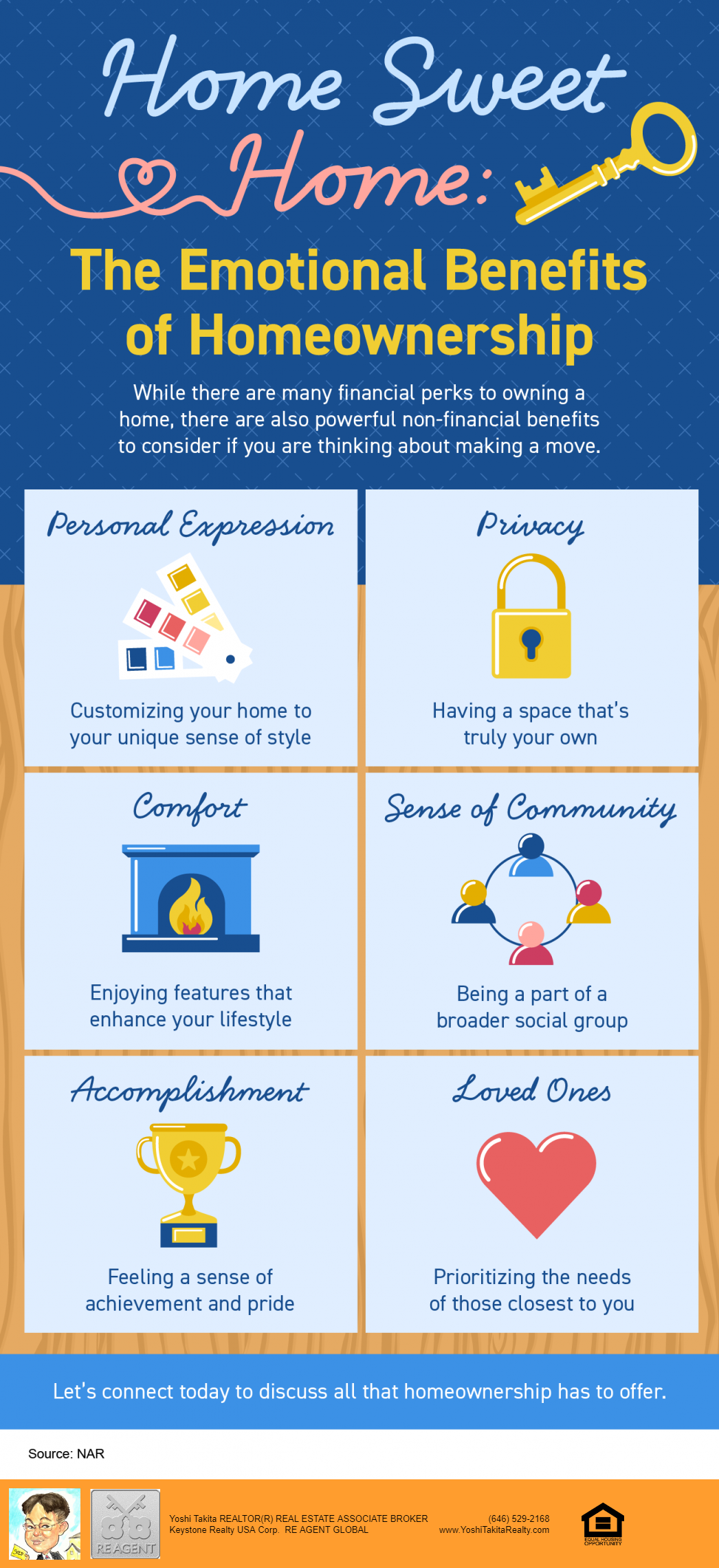 Home Sweet Home: The Emotional Benefits of Homeownership [INFOGRAPHIC] Home Sweet Home: The Emotional Benefits of Homeownership [INFOGRAPHIC] | MyKCM Some Highlights While there are many financial perks to owning a home, there are also powerful non-financial benefits to consider if you’re thinking about making a move. Homeownership allows you to express yourself, gives you greater privacy and comfort, enhances your connection to your community and loved ones, and is an achievement to feel proud of. Let’s connect today to discuss all that homeownership has to offer.