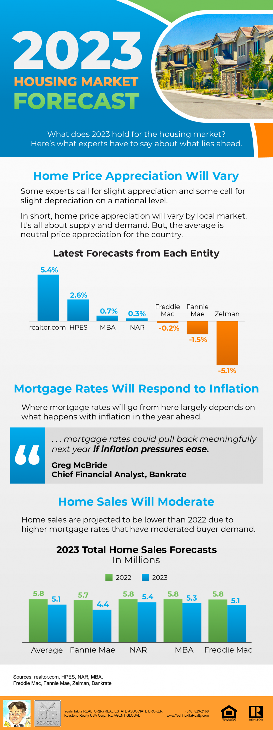 2023 Housing Market Forecast [INFOGRAPHIC] 2023 Housing Market Forecast [INFOGRAPHIC] | MyKCM Some Highlights From home sales to prices, the 2023 housing market will be defined by mortgage rates. And where rates go depends on what happens with inflation. If you’re thinking of buying or selling a home this year, let’s connect so you understand where the housing market is headed in 2023. Sources: realtor.com Home Price Expectations Survey (HPES) National Association of Realtors (NAR) Mortgage Bankers Association (MBA) Fannie Mae Freddie Mac Zelman & Associates Greg McBride, Chief Financial Analyst, Bankrate