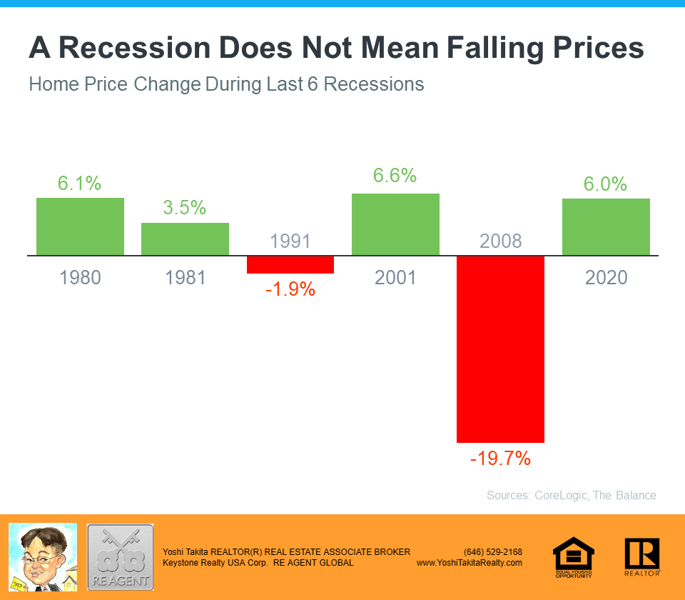 What Past Recessions Tell Us About the Housing Market What Past Recessions Tell Us About the Housing Market | MyKCM It doesn’t matter if you’re someone who closely follows the economy or not, chances are you’ve heard whispers of an upcoming recession. Economic conditions are determined by a broad range of factors, so rather than explaining them each in depth, let’s lean on the experts and what history tells us to see what could lie ahead. As Greg McBride, Chief Financial Analyst at Bankrate, says: “Two-in-three economists are forecasting a recession in 2023 . . .” As talk about a potential recession grows, you may be wondering what a recession could mean for the housing market. Here’s a look at the historical data to show what happened in real estate during previous recessions to help prove why you shouldn’t be afraid of what a recession could mean for the housing market today. A Recession Doesn’t Mean Falling Home Prices To show that home prices don’t fall every time there’s a recession, it helps to turn to historical data. As the graph below illustrates, looking at recessions going all the way back to 1980, home prices appreciated in four of the last six of them. So historically, when the economy slows down, it doesn’t mean home values will always fall. Most people remember the housing crisis in 2008 (the larger of the two red bars in the graph above) and think another recession would be a repeat of what happened to housing then. But today’s housing market isn’t about to crash because the fundamentals of the market are different than they were in 2008. According to experts, home prices will vary by market and may go up or down depending on the local area. But the average of their 2023 forecasts shows prices will net neutral nationwide, not fall drastically like they did in 2008. A Recession Means Falling Mortgage Rates Research also helps paint the picture of how a recession could impact the cost of financing a home. As the graph below shows, historically, each time the economy slowed down, mortgage rates decreased. What Past Recessions Tell Us About the Housing Market in 2023 | MyKCM Fortune explains mortgage rates typically fall during an economic slowdown: “Over the past five recessions, mortgage rates have fallen an average of 1.8 percentage points from the peak seen during the recession to the trough. And in many cases, they continued to fall after the fact as it takes some time to turn things around even when the recession is technically over.” In 2023, market experts say mortgage rates will likely stabilize below the peak we saw last year. That’s because mortgage rates tend to respond to inflation. And early signs show inflation is starting to cool. If inflation continues to ease, rates may fall a bit more, but the days of 3% are likely behind us. The big takeaway is you don’t need to fear the word recession when it comes to housing. In fact, experts say a recession would be mild and housing would play a key role in a quick economic rebound. As the 2022 CEO Outlook from KPMG, says: “Global CEOs see a ‘mild and short’ recession, yet optimistic about global economy over 3-year horizon . . . More than 8 out of 10 anticipate a recession over the next 12 months, with more than half expecting it to be mild and short.” Bottom Line While history doesn’t always repeat itself, we can learn from the past. According to historical data, in most recessions, home values have appreciated and mortgage rates have declined. If you’re thinking about buying or selling a home this year, let’s connect so you have expert advice on what’s happening in the housing market and what that means for your homeownership goals.