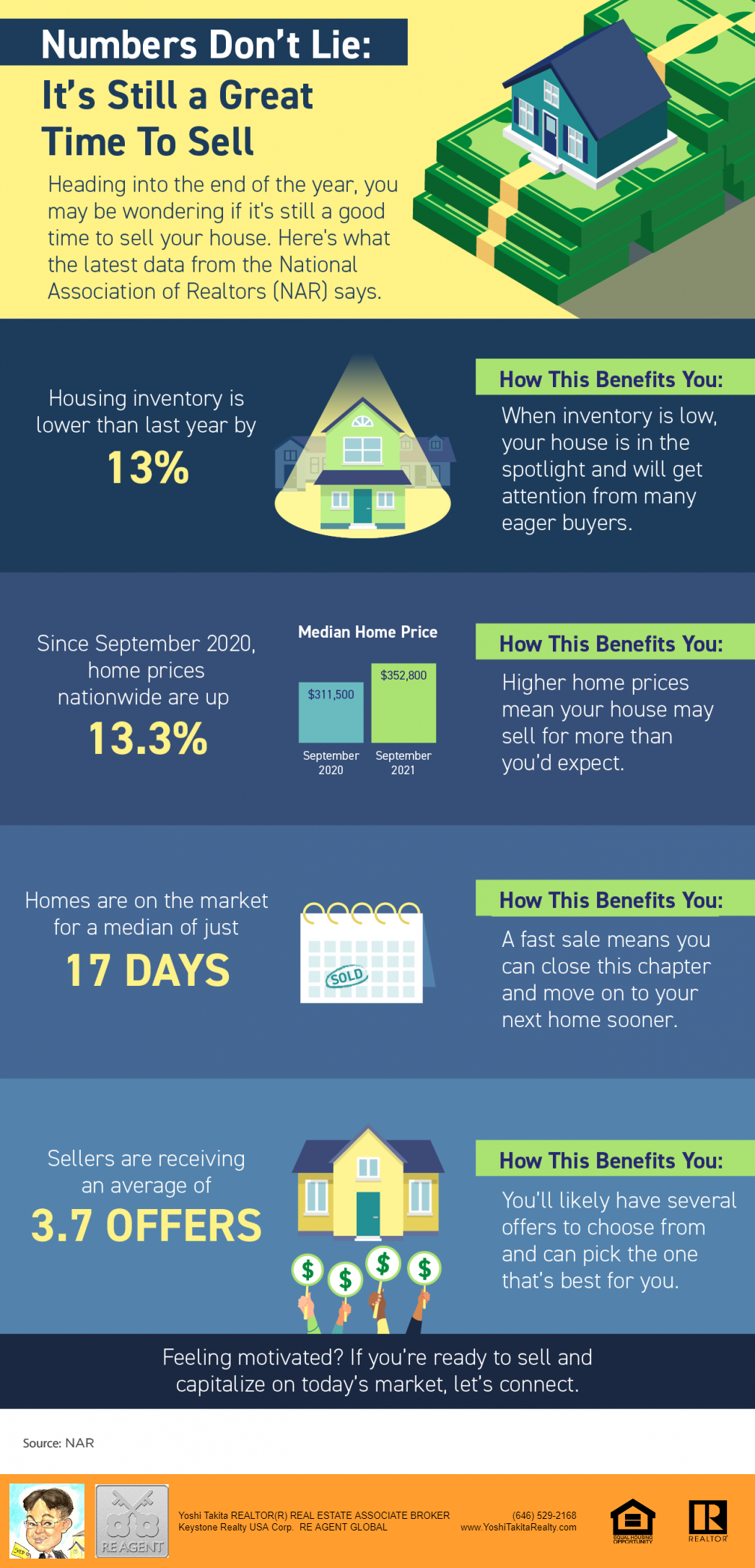 Continuing ReadingNumbers Don’t Lie – It’s Still a Great Time To Sell [INFOGRAPHIC] Numbers Don’t Lie – It’s Still a Great Time To Sell [INFOGRAPHIC] | MyKCM Some Highlights Heading into the end of the year, you might wonder if it’s still a good time to sell your house. Here’s what the latest data from the National Association of Realtors (NAR) says. Housing supply is lower than last year, and home prices are up nationwide. Meanwhile, the average home is selling fast and receiving several offers. Listing now puts your house in the spotlight, meaning it could sell quickly – and for more than you’d expect. Feeling motivated? If you’re ready to sell and capitalize on today's market, let’s connect.