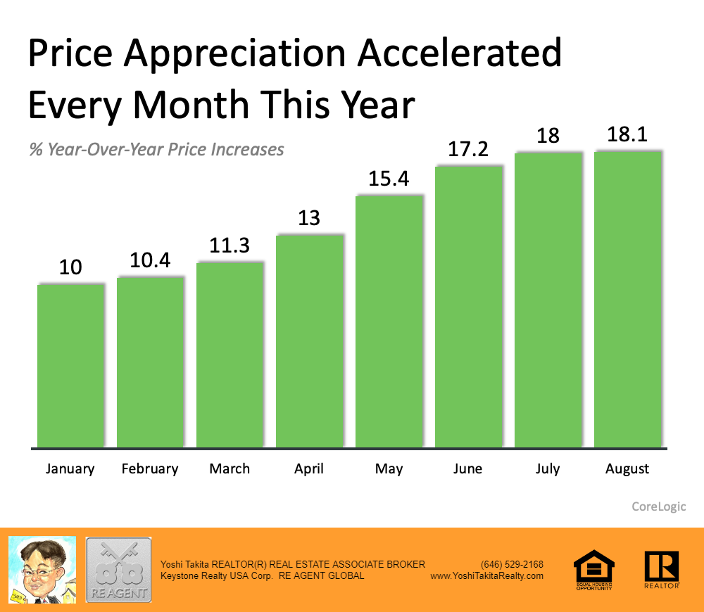 Continuing ReadingWhat’s Happening with Home Prices? What’s Happening with Home Prices? | MyKCM Many people have questions about home prices right now. How much have prices risen over the past 12 months? What’s happening with home values right now? What’s projected for next year? Here’s a look at the answers to all three of these questions. How much have home values appreciated over the last 12 months? According to the latest Home Price Index from CoreLogic, home values have increased by 18.1% compared to this time last year. Additionally, prices have gone up at an accelerated pace for each of the last eight months (see graph below):What’s Happening with Home Prices? | MyKCMThe increase in the rate of appreciation that’s shown by CoreLogic coincides with data from the other two main home price indices: the FHFA Home Price Index and the S&P Case Shiller Index. The last year has shown tremendous home price appreciation, which is resulting in a major gain in wealth for homeowners through rising equity. What’s happening with home prices right now? All three indices mentioned above also show that while appreciation is in the high double digits right now, that price acceleration is beginning to level off (see graph below):What’s Happening with Home Prices? | MyKCMYear-over-year appreciation is still close to 20%, but it’s clearly plateauing at that rate. Many experts believe it will drop below 15% by the end of the year. Keep in mind, that doesn’t mean home values will depreciate. It means the rate of appreciation will slow, yet stay well above the 25-year average of 5.1%. What about next year? The recent surge in prices is the result of heavy buyer demand and a shortage of homes available for sale. Most experts believe that as more housing inventory comes to market (both new construction and existing homes), the supply and demand for housing will come more into balance. That balance will bring a lower rate of appreciation in 2022. Here’s a look at home price forecasts from six major entities, and they all project future appreciation: Fannie Mae Freddie Mac Mortgage Bankers Association Home Price Expectation Survey Zelman & Associates National Association of Realtors What’s Happening with Home Prices? | MyKCMWhile the projected rate of appreciation varies among the experts, due to things like supply chain challenges, virus variants, and more, it’s clear that home values will continue to appreciate next year. Bottom Line There have been historic levels of home price appreciation over the last year. That pace will slow as we finish 2021 and enter into 2022. Prices will still rise in value, just at a much more moderate pace, which is good news for the housing market.