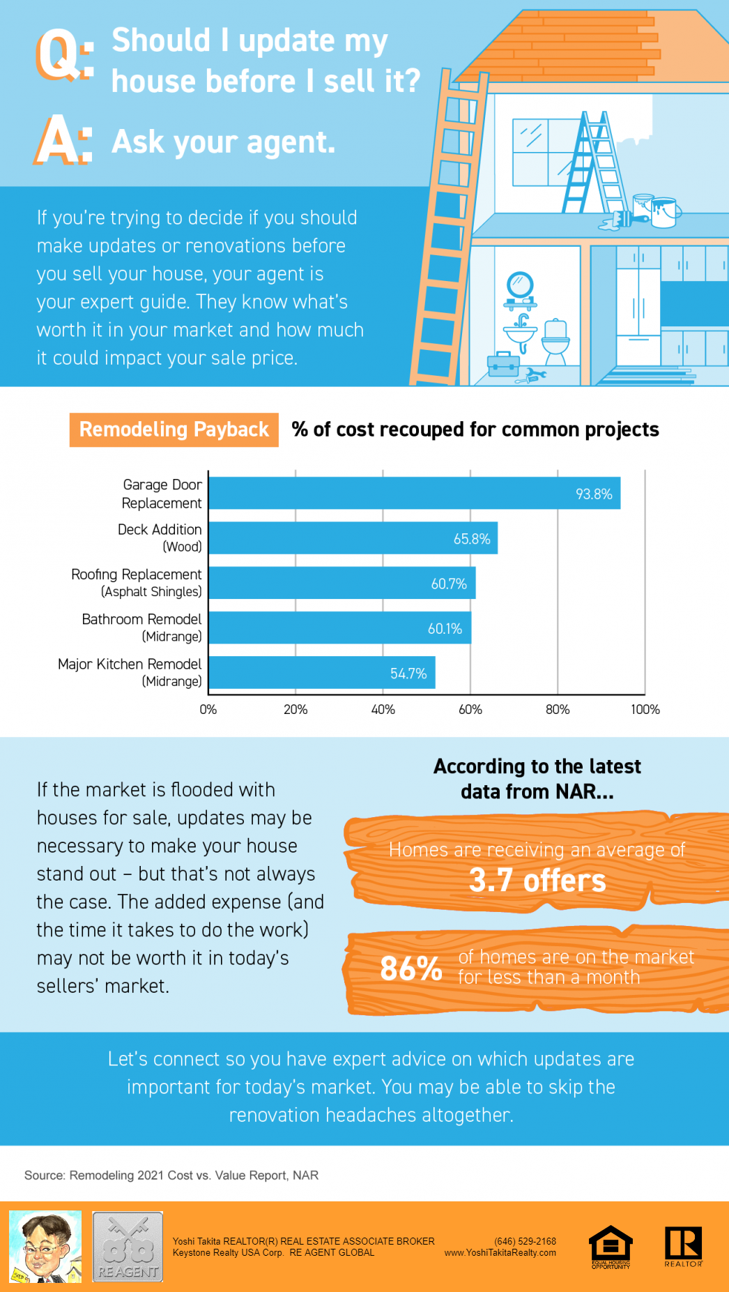 Continuing ReadingShould I Update My House Before I Sell It? [INFOGRAPHIC] Should I Update My House Before I Sell It? [INFOGRAPHIC] | MyKCM Some Highlights If you’re deciding whether you should make updates before you sell your house, lean on your agent to be your guide. If the market is flooded with houses for sale, updates may be necessary for your house to stand out. In our current sellers’ market, the added expenses might not be worth it. Let’s connect so you have expert advice on which updates are important in today’s market.