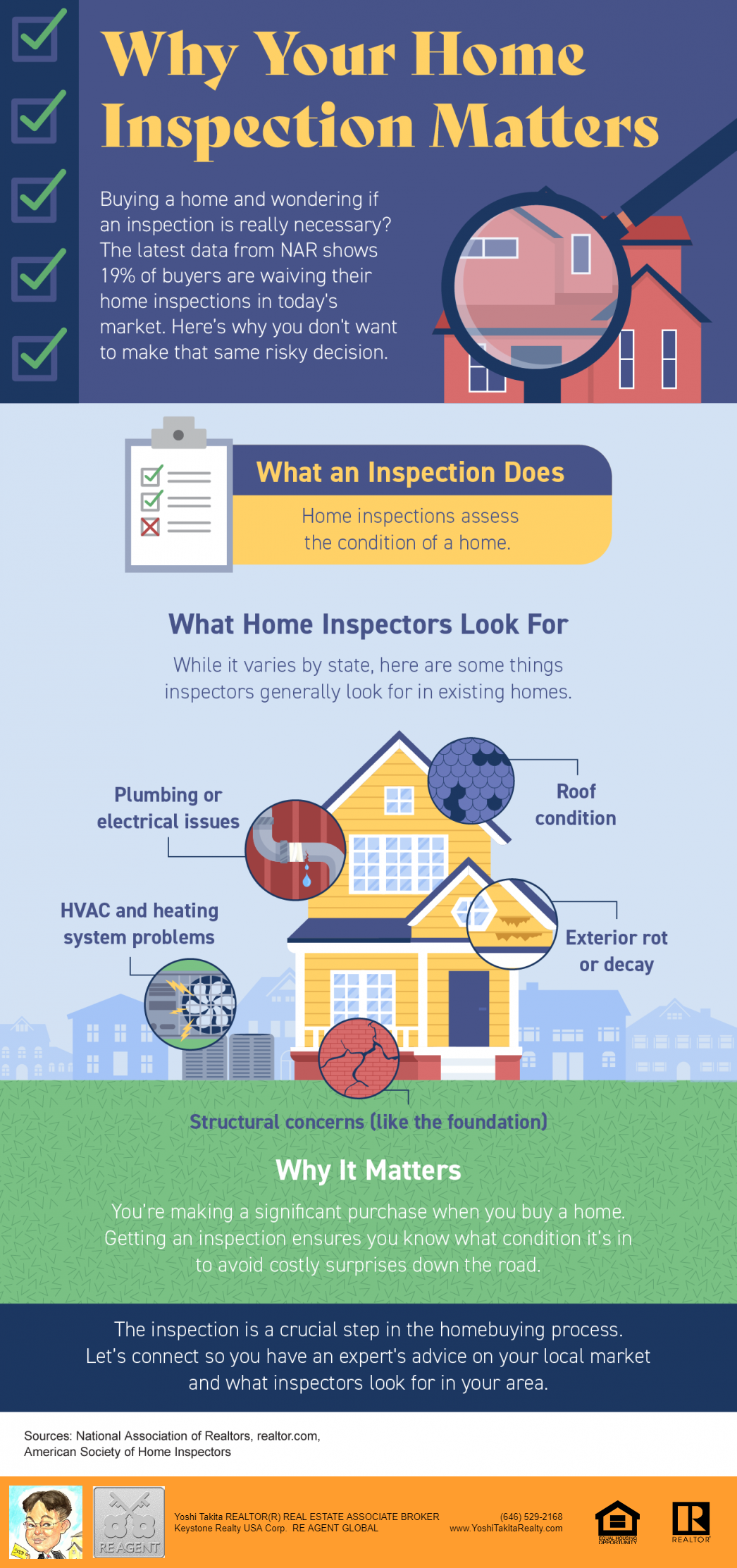 Continuing ReadingWhy Your Home Inspection Matters [INFOGRAPHIC] Why Your Home Inspection Matters [INFOGRAPHIC] | MyKCM Some Highlights Buying a home and wondering if your inspection is necessary? While some buyers may decide to waive their inspection, it’s risky decision. Your home inspection is a crucial step in the homebuying process. It assesses the condition of the home you plan to purchase, so you can avoid costly surprises down the road. Let’s connect so you have expert advice and a trusted professional who will keep your interests top of mind.