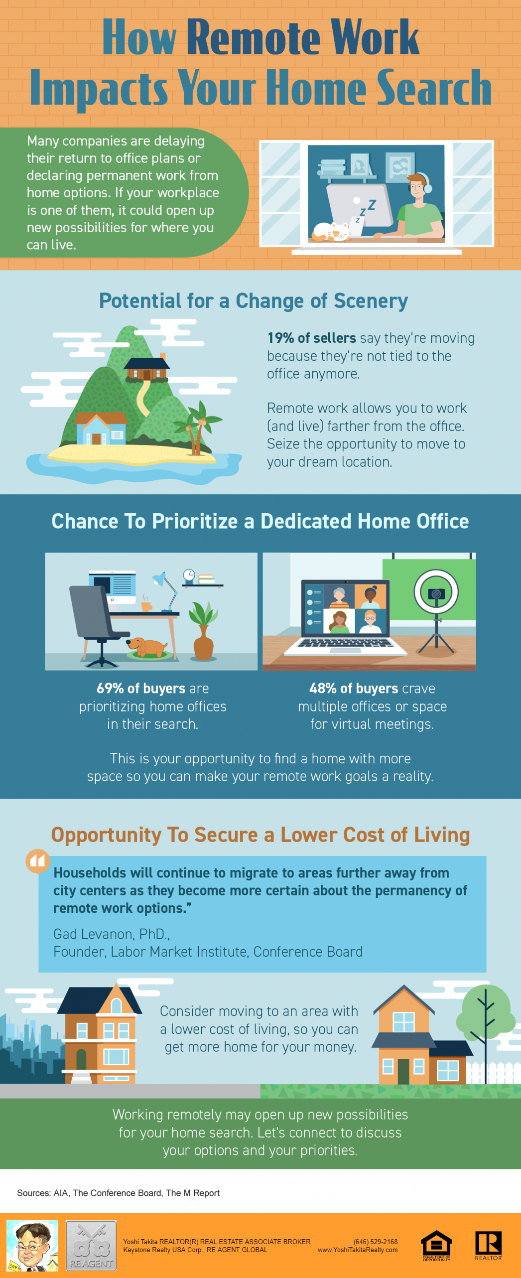 Continuing ReadingHow Remote Work Impacts Your Home Search [INFOGRAPHIC] How Remote Work Impacts Your Home Search [INFOGRAPHIC] | MyKCM Some Highlights If your workplace is delaying its return to office plans or is allowing permanent work from home options, that may open up new possibilities for your home search. Ongoing remote work could give you the chance for a change in scenery, a move to an area with a lower cost of living, or finding a home with more home office space. If you want to learn more about how remote work can give you more options, let’s connect to discuss your situation and priorities for your home search.