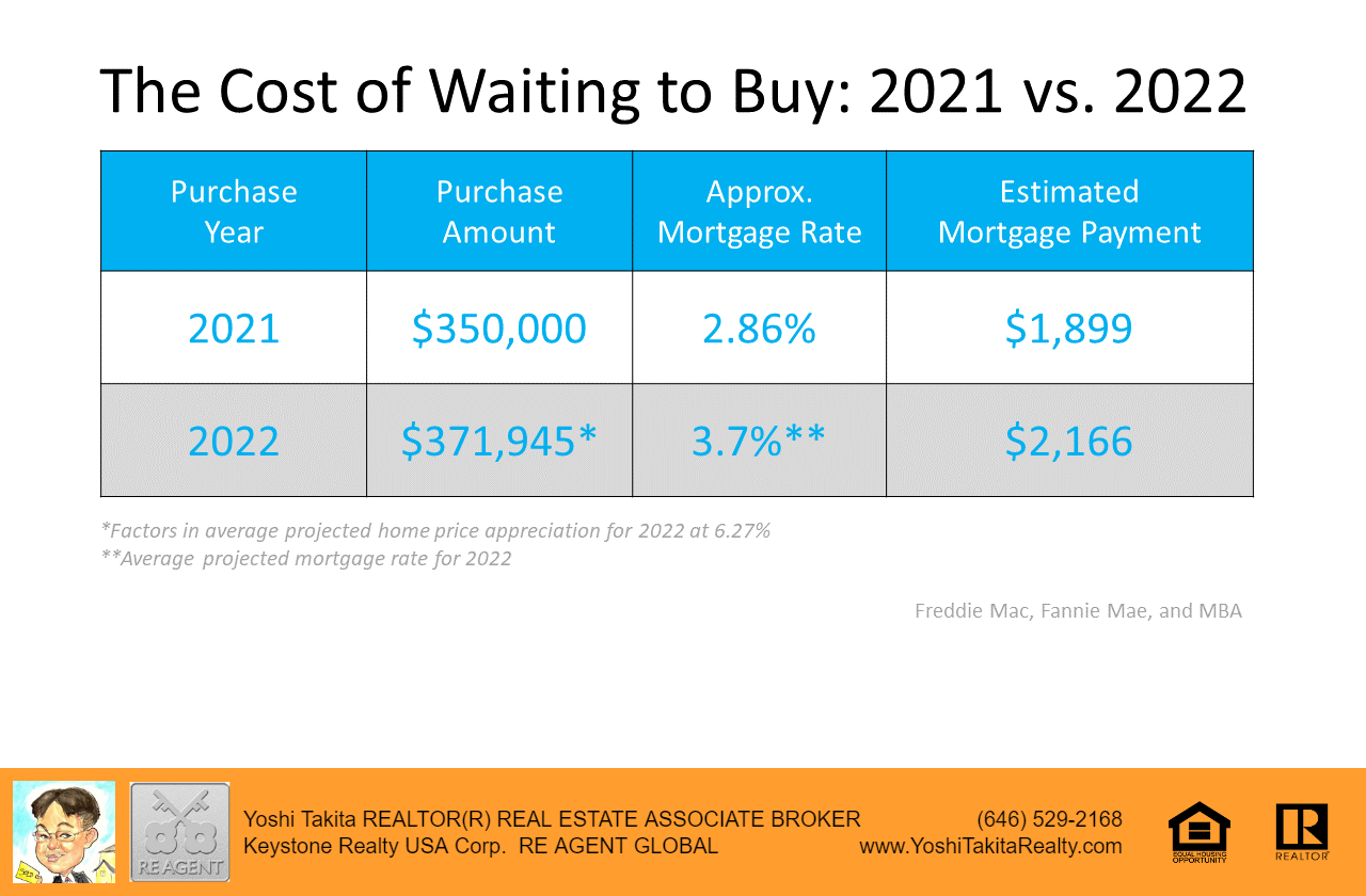 Two Reasons Why Waiting a Year To Buy Could Cost You Two Reasons Why Waiting a Year To Buy Could Cost You | MyKCM If you’re a renter with a desire to become a homeowner, or a homeowner who’s decided your current house no longer fits your needs, you may be hoping that waiting a year might mean better market conditions to purchase a home. To determine if you should buy now or wait, you need to ask yourself two simple questions: What will home prices be like in 2022? Where will mortgage rates be by the end of 2022? Let’s shed some light on the answers to both of these questions. What will home prices be like in 2022? Three major housing industry entities project continued home price appreciation for 2022. Here are their forecasts: Freddie Mac: 5.3% Fannie Mae: 5.1% Mortgage Bankers Association: 8.4% Using the average of the three projections (6.27%), a home that sells for $350,000 today would be valued at $371,945 by the end of next year. That means, if you delay, it could cost you more. As a prospective buyer, you could pay an additional $21,945 if you wait. Where will mortgage rates be by the end of 2022? Today, the 30-year fixed mortgage rate is hovering near historic lows. However, most experts believe rates will rise as the economy continues to recover. Here are the forecasts for the fourth quarter of 2022 by the three major entities mentioned above: Freddie Mac: 3.8% Fannie Mae: 3.2% Mortgage Bankers Association: 4.2% That averages out to 3.7% if you include all three forecasts, and it’s nearly a full percentage point higher than today’s rates. Any increase in mortgage rates will increase your cost. What does it mean for you if both home values and mortgage rates rise? You’ll pay more in mortgage payments each month if both variables increase. Let’s assume you purchase a $350,000 home this year with a 30-year fixed-rate loan at 2.86% after making a 10% down payment. According to the mortgage calculator from Smart Asset, your monthly mortgage payment (including principal and interest payments, and estimated home insurance, taxes in your area, and other fees) would be approximately $1,899. That same home could cost $371,945 by the end of 2022, and the mortgage rate could be 3.7% (based on the industry forecasts mentioned above). Your monthly mortgage payment, after putting down 10%, would increase to $2,166.Two Reasons Why Waiting a Year To Buy Could Cost You | MyKCM The difference in your monthly mortgage payment would be $267. That’s $3,204 more per year and $96,120 over the life of the loan. If you consider that purchasing now will also let you take advantage of the equity you’ll build up over the next calendar year, which is approximately $22,000 for a house with a similar value, then the total net worth increase you could gain from buying this year is over $118,000. Bottom Line When asking if you should buy a home, you probably think of the non-financial benefits of owning a home as a driving motivator. When asking when to buy, the financial benefits make it clear that doing so now is much more advantageous than waiting until next year.