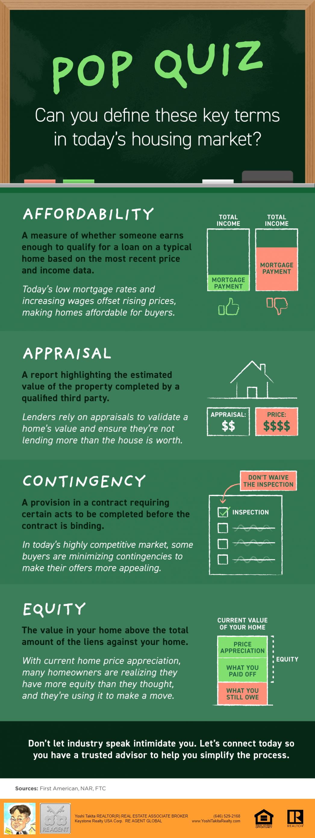 Continuing ReadingPop Quiz: Can You Define These Key Terms in Today’s Housing Market? [INFOGRAPHIC] Pop Quiz: Can You Define These Key Terms in Today’s Housing Market? [INFOGRAPHIC] | MyKCM Some Highlights The language of buying and selling a home may sound scary at first, but knowing how key terms relate to today’s market can help you. For example, current low mortgage rates and higher wages positively impact affordability for buyers, while home price appreciation continues to grow home equity, which sellers can use to fuel a move up. Terms like appraisal (what lenders rely on to validate a home’s value) and contingencies (which buyers can minimize to make their offer stand out) directly impact the transaction. You don’t need to be fluent in the language of the market to buy or sell. Instead, let’s connect today so that we can translate the process together.