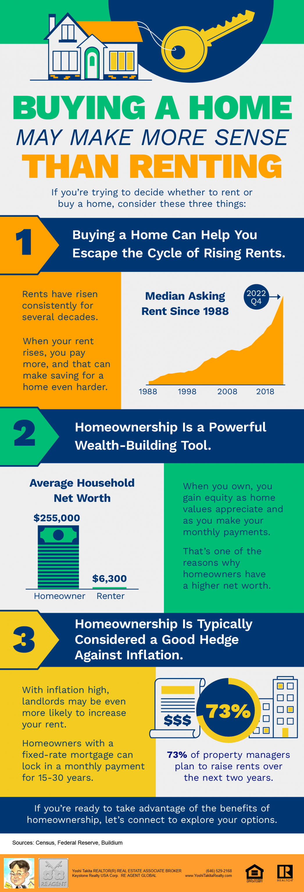 Buying a Home May Make More Sense Than Renting [INFOGRAPHIC] Buying a Home May Make More Sense Than Renting [INFOGRAPHIC] | MyKCM Some Highlights If you’re trying to decide whether to rent or buy a home, there are a few things you should consider. Homeownership can help you escape the cycle of rising rents, builds your wealth, and serves as a hedge against inflation. If you’re ready to take advantage of the benefits of homeownership, let’s connect to explore your options.