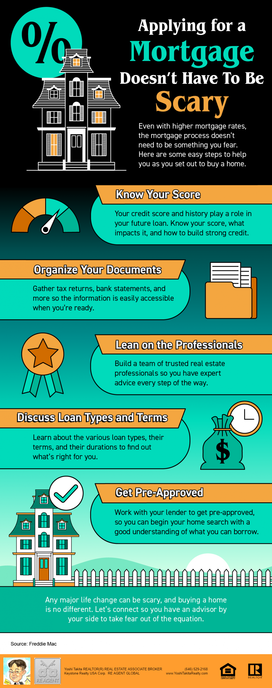 Continuing ReadingApplying for a Mortgage Doesn’t Have To Be Scary [INFOGRAPHIC] Applying for a Mortgage Doesn’t Have To Be Scary [INFOGRAPHIC] | MyKCM Some Highlights Even with higher mortgage rates, the mortgage process doesn’t need to be something you fear. Here are some steps to help as you set out to buy a home. Know your credit score and work to build strong credit. When you’re ready, lean on the pros and connect with a lender so you can get pre-approved and begin your home search. Any major life change can be scary, and buying a home is no different. Let’s connect so you have an advisor by your side to take fear out of the equation.
