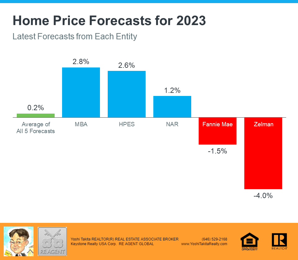 Continuing ReadingWhat’s Ahead for Home Prices? What’s Ahead for Home Prices? | MyKCM As the housing market cools in response to the dramatic rise in mortgage rates, home price appreciation is cooling as well. And if you’re following along with headlines in the media, you’re probably seeing a wide range of opinions calling for everything from falling home prices to ongoing appreciation. But what’s true? What’s most likely to happen moving forward? While opinions differ, the most likely outcome is we’ll fall somewhere in the middle of slight appreciation and slight depreciation. Here’s a look at the latest expert projections so you have the best information possible today. What the Experts Are Saying About Home Prices Next Year The graph below shows the most up-to-date forecasts from five experts in the housing industry. These are the experts that have most recently updated their projections based on current market trends: What’s Ahead for Home Prices? | MyKCM As the graph shows, the three blue bars represent experts calling for ongoing home price appreciation, just at a more moderate rate than recent years. The red bars on the graph are experts calling for home price depreciation. While there isn’t a clear consensus, if you take the average (shown in green) of all five of these forecasts, the most likely outcome is, nationally, home price appreciation will be fairly flat next year. What Does This Mean? Basically, experts are divided on what’s ahead for 2023. Home prices will likely depreciate slightly in some markets and will continue to gain ground in others. It all depends on the conditions in your local market, like how overheated that market was in recent years, current inventory levels, buyer demand, and more. The good news is home prices are expected to return to more normal levels of appreciation rather quickly. The latest forecast from Wells Fargo shows that, while they feel prices will fall in 2023, they think prices will recover and net positive in 2024. That forecast calls for 3.1% appreciation in 2024, which is a number much more in line with the long-term average of 4% annual appreciation. And the Home Price Expectation Survey (HPES) from Pulsenomics, a poll of over one hundred industry experts, also calls for ongoing appreciation of roughly 2.6 to 4% from 2024-2026. This goes to show, even if prices decline slightly next year, it’s not expected to be a lasting trend. As Jason Lewris, Co-Founder and Chief Data Officer for Parcl, says: “In the absence of trustworthy, up-to-date information, real estate decisions are increasingly being driven by fear, uncertainty, and doubt.” Don’t let fear or uncertainty change your plans. If you’re unsure about where prices are headed or how to make sense of what’s going on in today’s housing market, reach out to a local real estate professional for the guidance you need each step of the way. Bottom Line The housing market is shifting, and it’s a confusing place right now. Let’s connect so you have a trusted real estate professional to help you make confident and informed decisions about what’s happening in our market.