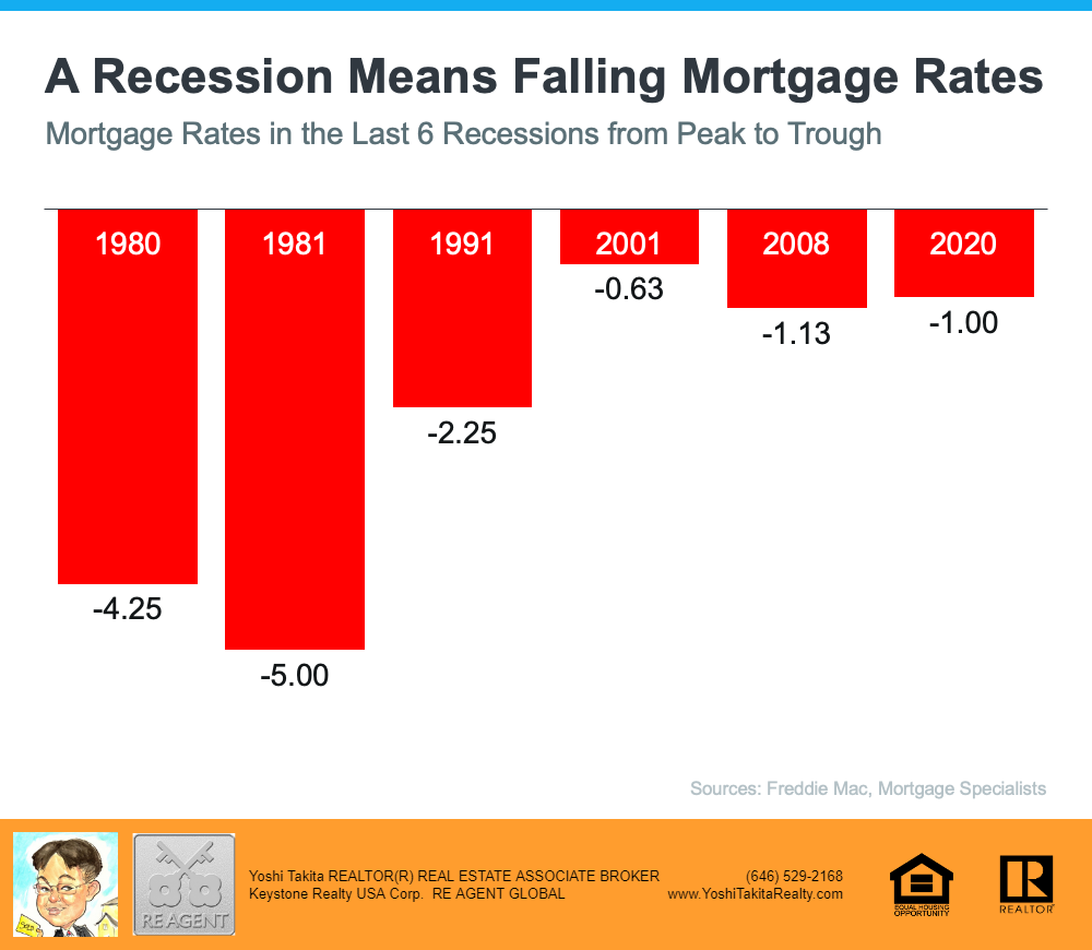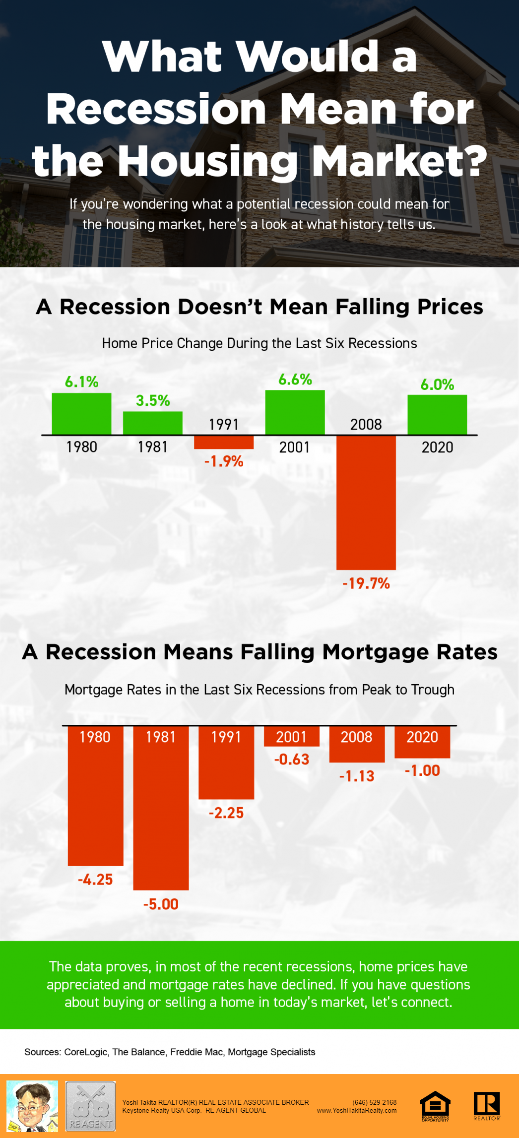 Continuing ReadingWhat Would a Recession Mean for the Housing Market? What Would a Recession Mean for the Housing Market? | MyKCM According to a recent survey from the Wall Street Journal, the percentage of economists who believe we’ll see a recession in the next 12 months is growing. When surveyed in July 2021, only 12% of economists consulted thought there’d be a recession by now. But this July, when polled, 49% believe we will see a recession in the coming 12 months. And as more recession talk fills the air, one concern many people have is: should I delay my homeownership plans if there’s a recession? Here’s a look at historical data to show what happened in real estate during previous recessions to help prove why you shouldn’t be afraid of what a recession would mean for the housing market today. A Recession Doesn’t Mean Falling Home Prices To show that home prices don’t fall every time there’s a recession, it helps to turn to historical data. As the graph below illustrates, looking at the recessions going all the way back to 1980, home prices appreciated in four of the last six recessions. So, historically, when the economy slows down, it doesn’t mean home values will fall. What Would a Recession Mean for the Housing Market? | MyKCM Most people remember the housing crisis in 2008 (the larger of the two red bars in the graph above) and think another recession would repeat what happened then. But this housing market isn’t about to crash. The fundamentals are very different today than they were in 2008. So, don’t assume we’re heading down the same path. A Recession Means Falling Mortgage Rates Research also helps paint the picture of how a recession could impact the cost of financing a home. As the chart below shows, historically, each time the economy slowed down, mortgage rates decreased. What Would a Recession Mean for the Housing Market? | MyKCM Fortune explains that mortgage rates typically fall during an economic slowdown: “Over the past five recessions, mortgage rates have fallen an average of 1.8 percentage points from the peak seen during the recession to the trough. And in many cases, they continued to fall after the fact as it takes some time to turn things around even when the recession is technically over.” And while history doesn’t always repeat itself, we can learn from and find comfort in the historical data. Bottom Line There’s no doubt everyone remembers what happened in the housing market in 2008. But you don’t need to fear the word recession if you’re planning to buy or sell a home. According to historical data, in most recessions, home price gains have stayed strong, and mortgage rates have declined. If you’re thinking about buying or selling a home, let’s connect so you have expert advice on what’s happening in the housing market and what that means for your homeownership goals.