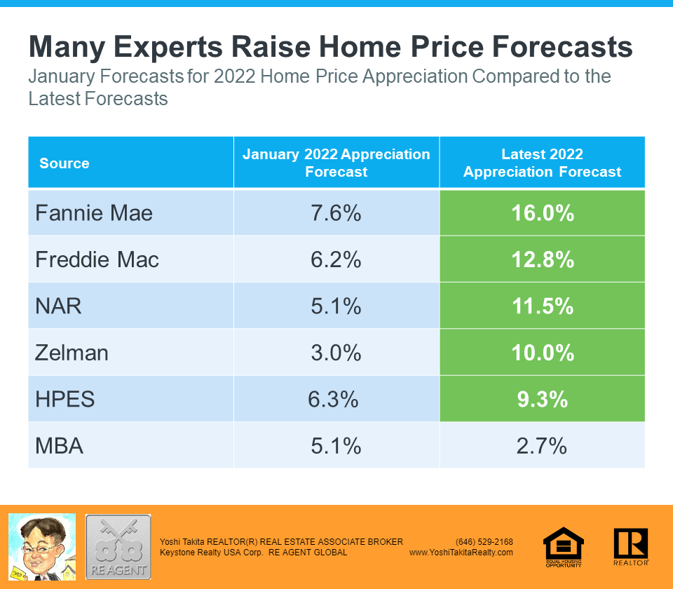 Continuing ReadingExperts Increase 2022 Home Price Projections Experts Increase 2022 Home Price Projections | MyKCM If you’re wondering if home prices are going to come down due to the cooldown in the housing market or a potential recession, here’s what you need to know. Not only are experts forecasting home prices will continue to appreciate nationwide this year, but most of them also actually increased their projections for home price appreciation from their original 2022 forecasts (shown in green in the chart below): Experts Increase 2022 Home Price Projections | MyKCMAs the chart shows, most sources adjusted up, and now call for more appreciation in 2022 than they originally projected this January. But why are experts so confident the housing market will see ongoing appreciation? It’s because of supply and demand in most markets. As Bankrate says: “After all, supplies of homes for sale remain near record lows. And while a jump in mortgage rates has dampened demand somewhat, demand still outpaces supply, thanks to a combination of little new construction and strong household formation by large numbers of millennials.” Knowing that experts forecast home prices will continue to appreciate in most markets and that they’ve actually increased their original projections for this year should help you answer the question: will home prices fall? According to the latest forecasts, experts are confident prices will continue to appreciate this year, although at a more moderate rate than they did in 2021. Bottom Line If you’re worried home prices are going to decline, rest assured many experts raised their forecasts to say they’ll continue to appreciate in most markets this year. If you have questions about what’s happening with home prices in our local area, let's connect.