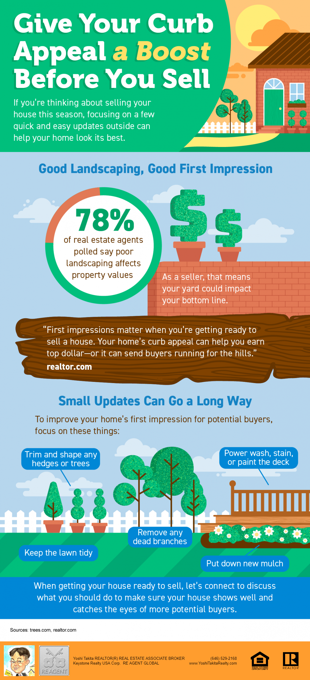 Continuing ReadingGive Your Curb Appeal a Boost Before You Sell [INFOGRAPHIC] Give Your Curb Appeal a Boost Before You Sell [INFOGRAPHIC] | MyKCM Some Highlights If you’re thinking about selling your house this season, focusing on a few quick and easy updates outside can help your home look its best. 78% of real estate agents polled say poor landscaping affects property values. As a seller, that means your yard could impact your bottom line. When getting your house ready to sell, let’s connect to discuss what you should do to make sure your house shows well and catches the eyes of more potential buyers.