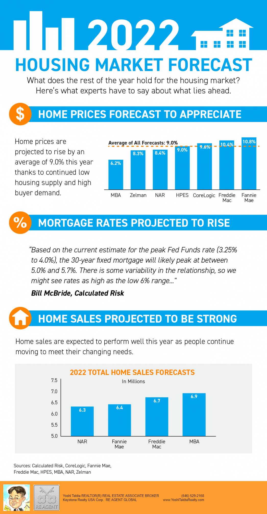 Continuing Reading2022 Housing Market Forecast [INFOGRAPHIC] 2022 Housing Market Forecast [INFOGRAPHIC] | MyKCM Some Highlights What does the rest of the year hold for the housing market? Here’s what experts have to say about what lies ahead. Home prices are projected to rise and so are mortgage rates. Experts are also forecasting another strong year for home sales as people move to meet their changing needs. Let’s connect so you can make your best move this year.