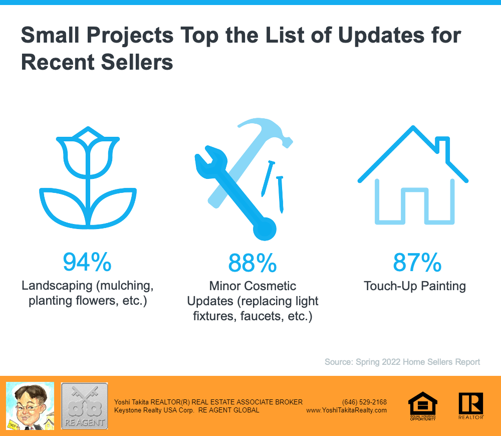 Continuing ReadingYour House Could Be Closer to List-Ready Than You Think Your House Could Be Closer to List-Ready Than You Think | MyKCM One of the biggest concerns for a homeowner looking to sell is the time they’ll have to put in before listing their house. If that’s the case for you, you should know – your home might be closer to list-ready than you think in today’s housing market. A survey of recent sellers from realtor.com finds that many were able to get their house ready in less than a month. It says: “With many homeowners expecting a quick sale, and in many cases a lack of contingencies, the preparation process took less than a month for over 50% of home sellers this past year, with 20% completing it in less than two weeks.” Those sellers expecting to sell quickly are following recent buyer trends. With mortgage rates and home prices rising, buyers in today’s market are serious about finding a home quickly. But with the limited number of homes for sale, there are very few options for those buyers to choose from. That means many may be willing to take on projects after they purchase. Because of this, you may be able to focus on less time-consuming tasks before putting your house on the market. According to the survey mentioned above, some of the top things recent sellers completed before listing over the past year include landscaping, making minor cosmetic updates, and touching-up paint (see image below): Your House Could Be Closer to List-Ready Than You Think | MyKCM A Real Estate Advisor Will Help Streamline the Process and Keep You Focused Of course, each situation is different, and knowing what repairs or updates your house needs to stand out in your local area is critical. That’s where a trusted real estate professional comes in. In a recent article, NextAdvisor explains: “. . . Real estate can be hyper-local, and demand can vary from one neighborhood to the next. It’s a good idea to work with a local real estate professional to determine an ideal listing price and if any improvements or repairs need to be completed before putting your home on the market.” Your trusted real estate advisor knows the ins and outs of the market in your specific area. They’ll help you identify the places where you should and shouldn’t spend your time and money – and that can enable you to list quickly. Bottom Line If you’re ready to take advantage of the incredible conditions for sellers in today’s real estate market but are worried about the time it’ll take to get your home ready, you might be closer than you think. Let’s connect so you can see what you need to do before listing your house today.