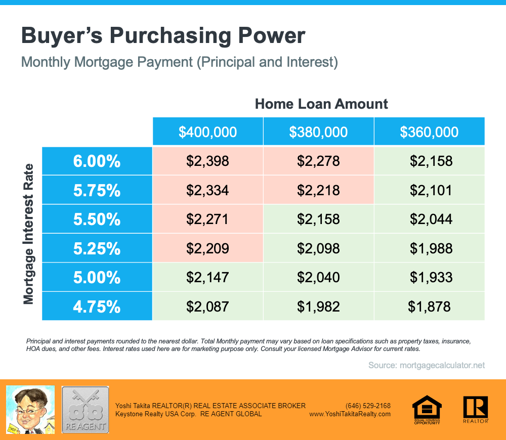 How Today’s Mortgage Rates Impact Your Home Purchase How Today’s Mortgage Rates Impact Your Home Purchase | MyKCM If you’re planning to buy a home, it’s critical to understand the relationship between mortgage rates and your purchasing power. Purchasing power is the amount of home you can afford to buy that’s within your financial reach. Mortgage rates directly impact the monthly payment you’ll have on the home you purchase. So, when rates rise, so does the monthly payment you’re able to lock in on your home loan. In a rising-rate environment like we’re in today, that could limit your future purchasing power. Today, the average 30-year fixed mortgage rate is above 5%, and in the near term, experts say that’ll likely go up in the months ahead. You have the opportunity to get ahead of that increase if you buy now before that impacts your purchasing power. Mortgage Rates Play a Large Role in Your Home Search The chart below can help you understand the general relationship between mortgage rates and a typical monthly mortgage payment within a range of loan amounts. Let’s say your budget allows for a monthly mortgage payment in the $2,100-$2,200 range. The green in the chart indicates a payment within that range, while the red is a payment that exceeds it (see chart below): How Today’s Mortgage Rates Impact Your Home Purchase | MyKCM As the chart shows, you’re more likely to exceed your target payment range as mortgage rates increase unless you pursue a lower home loan amount. If you’re ready to buy a home, use this as your motivation to purchase now so you can get ahead of rising rates before you have to make the decision to decrease what you borrow in order to stay comfortably within your budget. Work with Trusted Advisors To Know Your Budget and Make a Plan It’s critical to keep your budget top of mind as you’re searching for a home. Danielle Hale, Chief Economist at realtor.com, puts it best, advising that buyers should: “Get preapproved with where rates are today, but also consider what would happen if rates were to go up, say another quarter of a point, . . . Know what that would do to your monthly costs and how comfortable you are with that, so that if rates do move higher, you already know how you need to adjust in response.” No matter what, the best strategy is to work with your real estate advisor and a trusted lender to create a plan that takes rising mortgage rates into consideration. Together, you can look at your budget based on where rates are today and craft a strategy so you’re ready to adjust as rates change. Bottom Line Even small increases in mortgage rates can impact your purchasing power. If you’re in the process of buying a home, it’s more important than ever to have a strong plan. Let’s connect so you have a trusted real estate advisor and a lender on your side who can help you strategize to achieve your dream of homeownership this season.